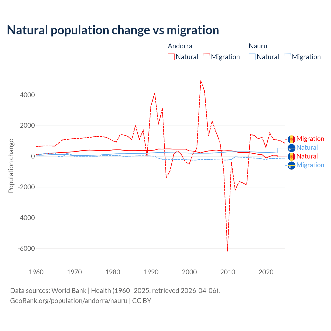 Over the last 10 years, 16.2% of the population change in Andorra is from natural causes (a gain of 1,123 people) and 83.8% is from migration (a gain of 5,802 people). In Nauru 66.2% is from natural causes (a gain of 2,590 people) and 33.8% is from migration (a loss of 1,320 people).