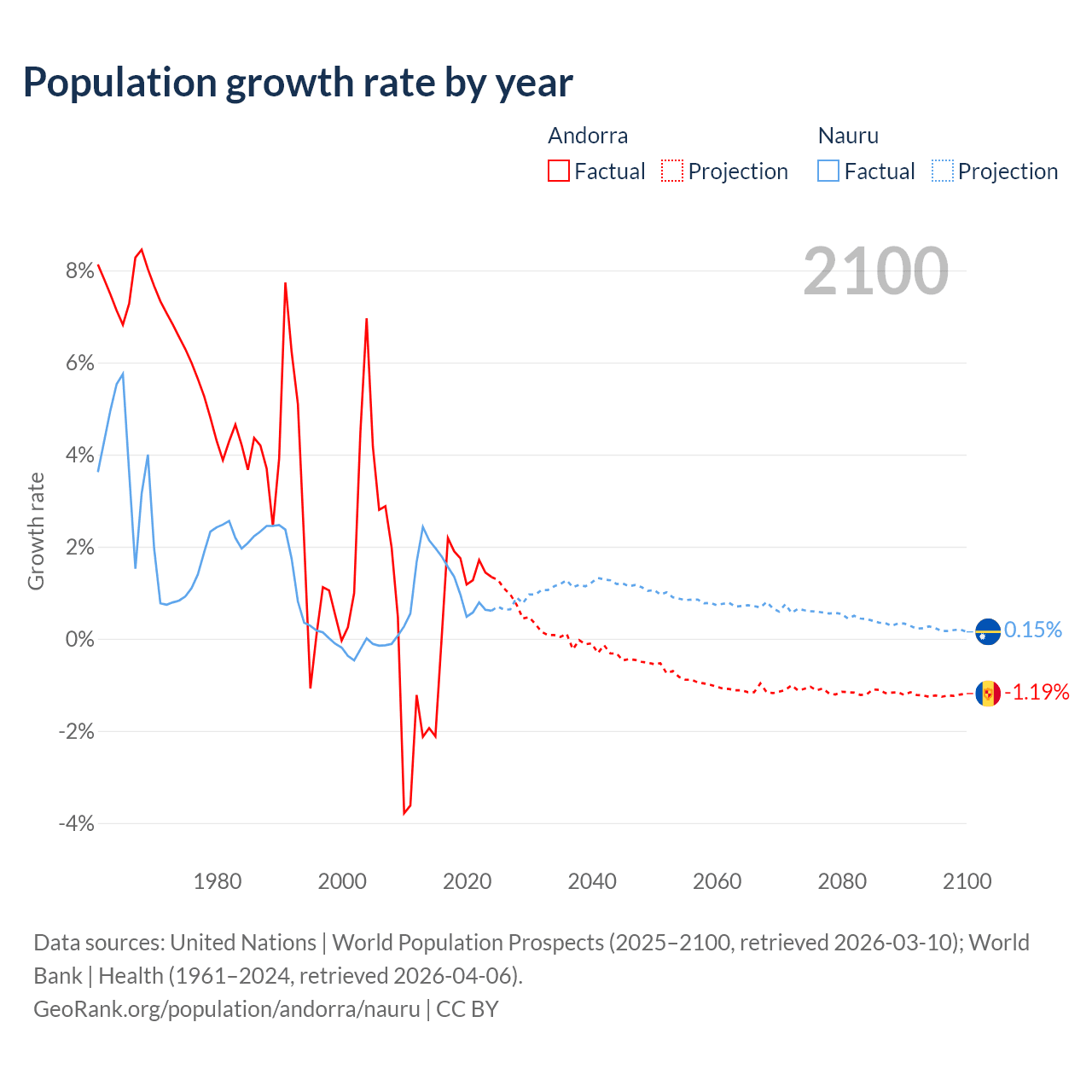 - For the last 10 years, Andorra has had an average growth rate of +0.79% per year vs +1.17% in Nauru.