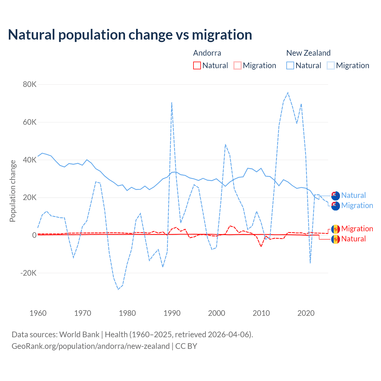Over the last 10 years, 16.2% of the population change in Andorra is from natural causes (a gain of 1,123 people) and 83.8% is from migration (a gain of 5,802 people). In New Zealand 34.4% is from natural causes (a gain of 247,767 people) and 65.6% is from migration (a gain of 471,602 people).