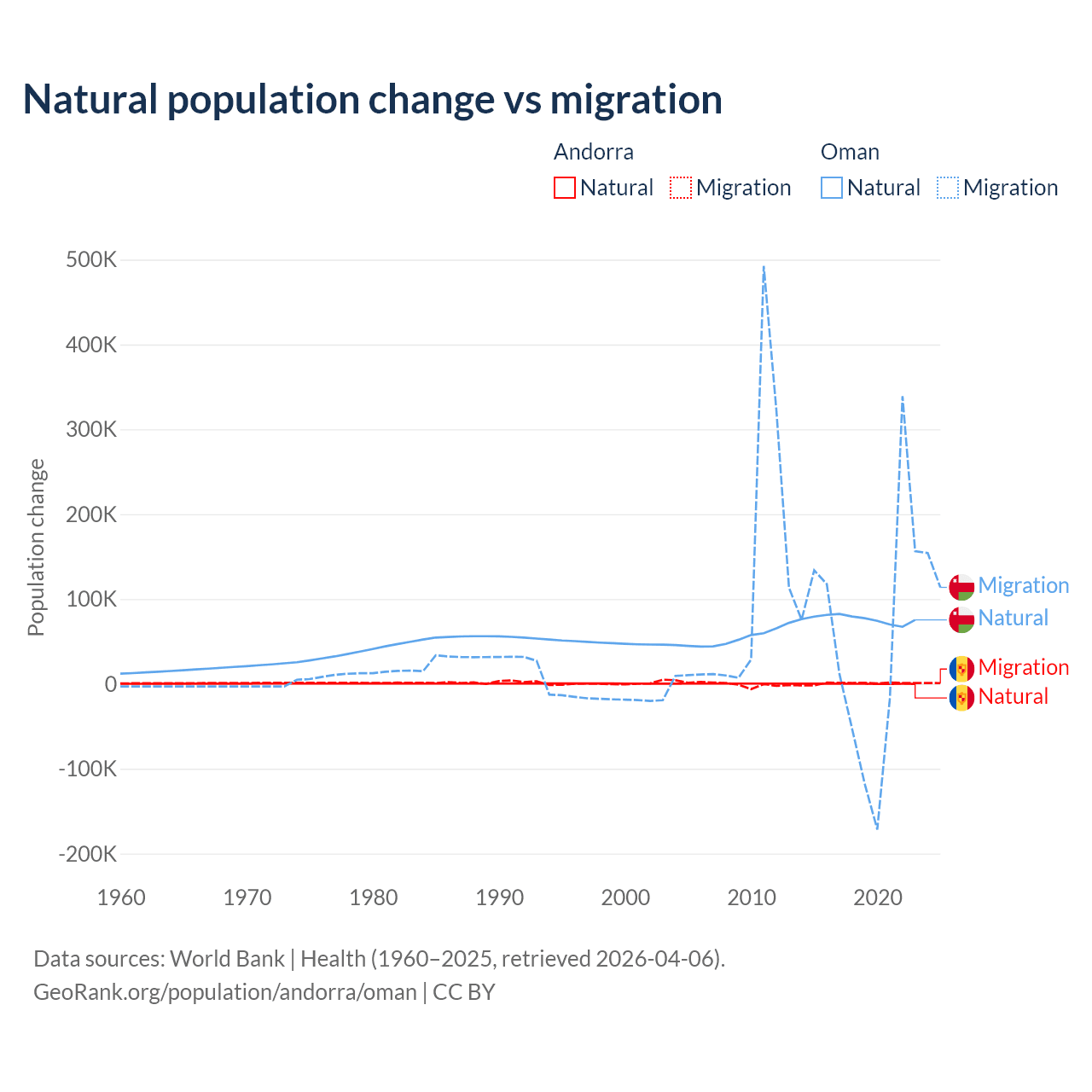 Over the last 10 years, 16.2% of the population change in Andorra is from natural causes (a gain of 1,123 people) and 83.8% is from migration (a gain of 5,802 people). In Oman 61.6% is from natural causes (a gain of 763,049 people) and 38.4% is from migration (a gain of 475,565 people).