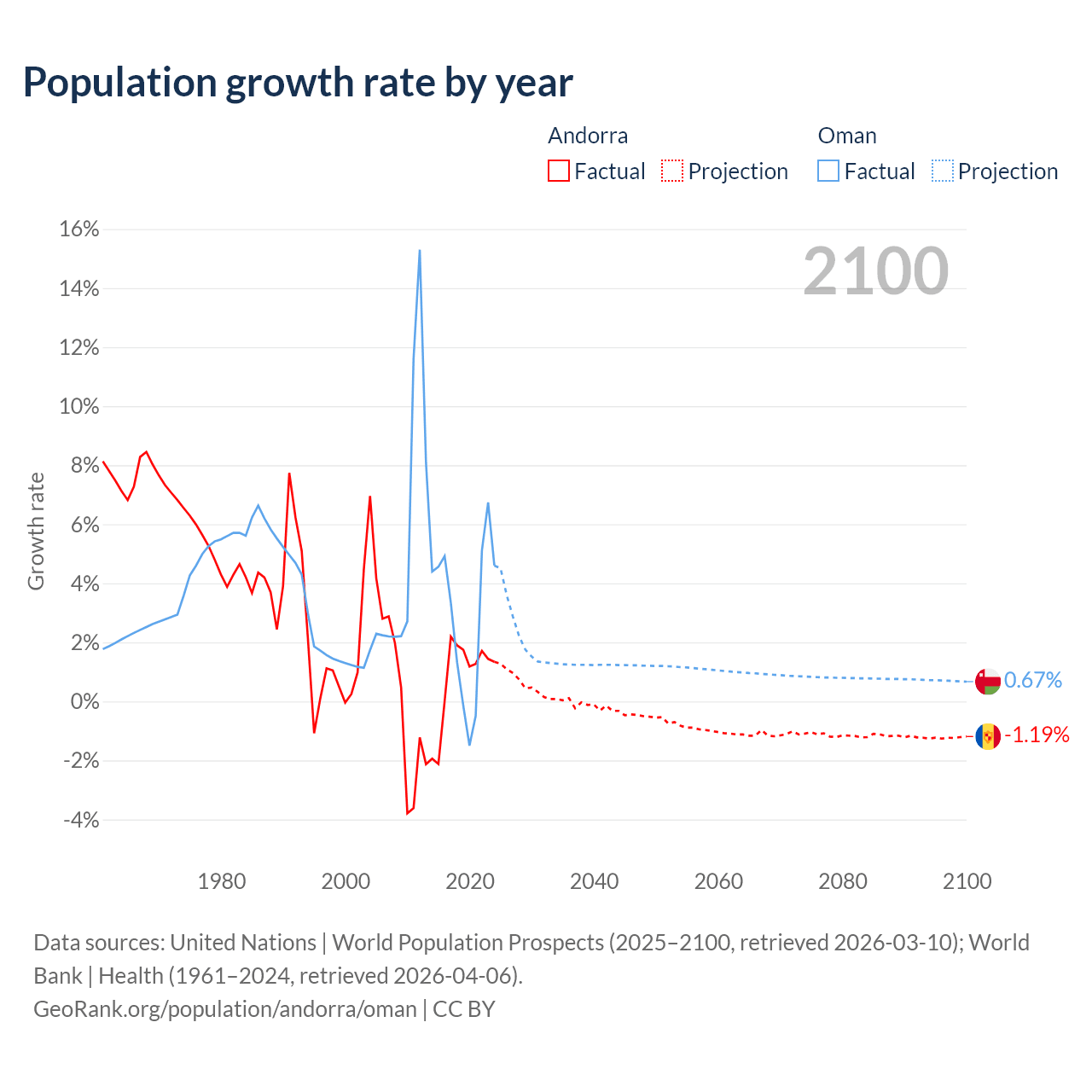 - For the last 10 years, Andorra has had an average growth rate of +0.79% per year vs +2.99% in Oman.