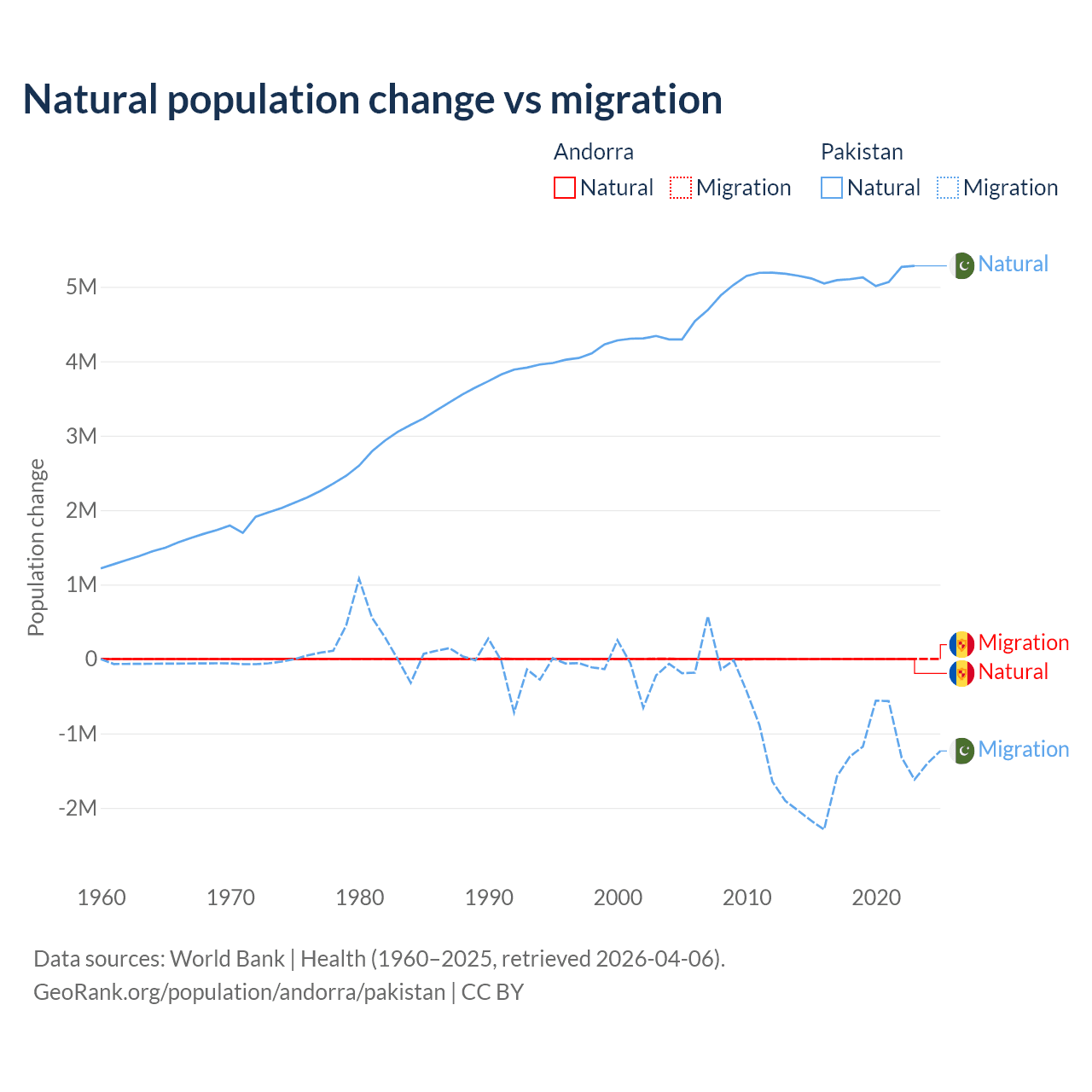 Over the last 10 years, 16.2% of the population change in Andorra is from natural causes (a gain of 1,123 people) and 83.8% is from migration (a gain of 5,802 people). In Pakistan 77.8% is from natural causes (a gain of 51,255,404 people) and 22.2% is from migration (a loss of 14,629,055 people).