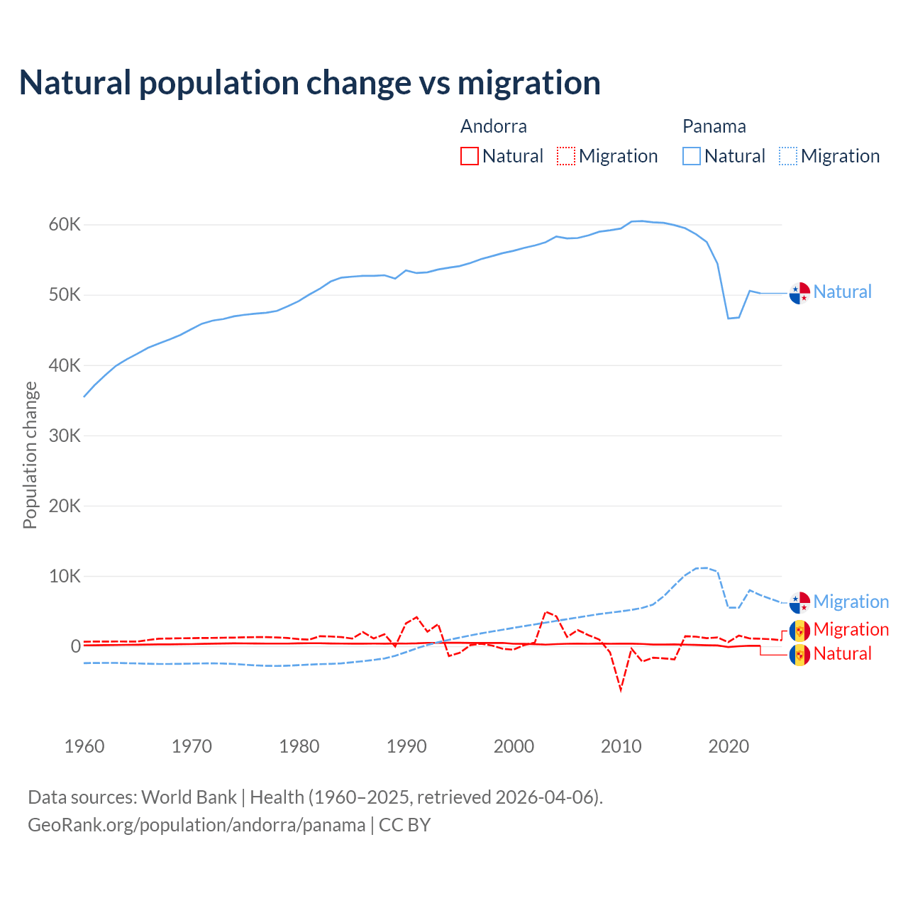 Over the last 10 years, 16.2% of the population change in Andorra is from natural causes (a gain of 1,123 people) and 83.8% is from migration (a gain of 5,802 people). In Panama 86.5% is from natural causes (a gain of 544,211 people) and 13.5% is from migration (a gain of 84,849 people).