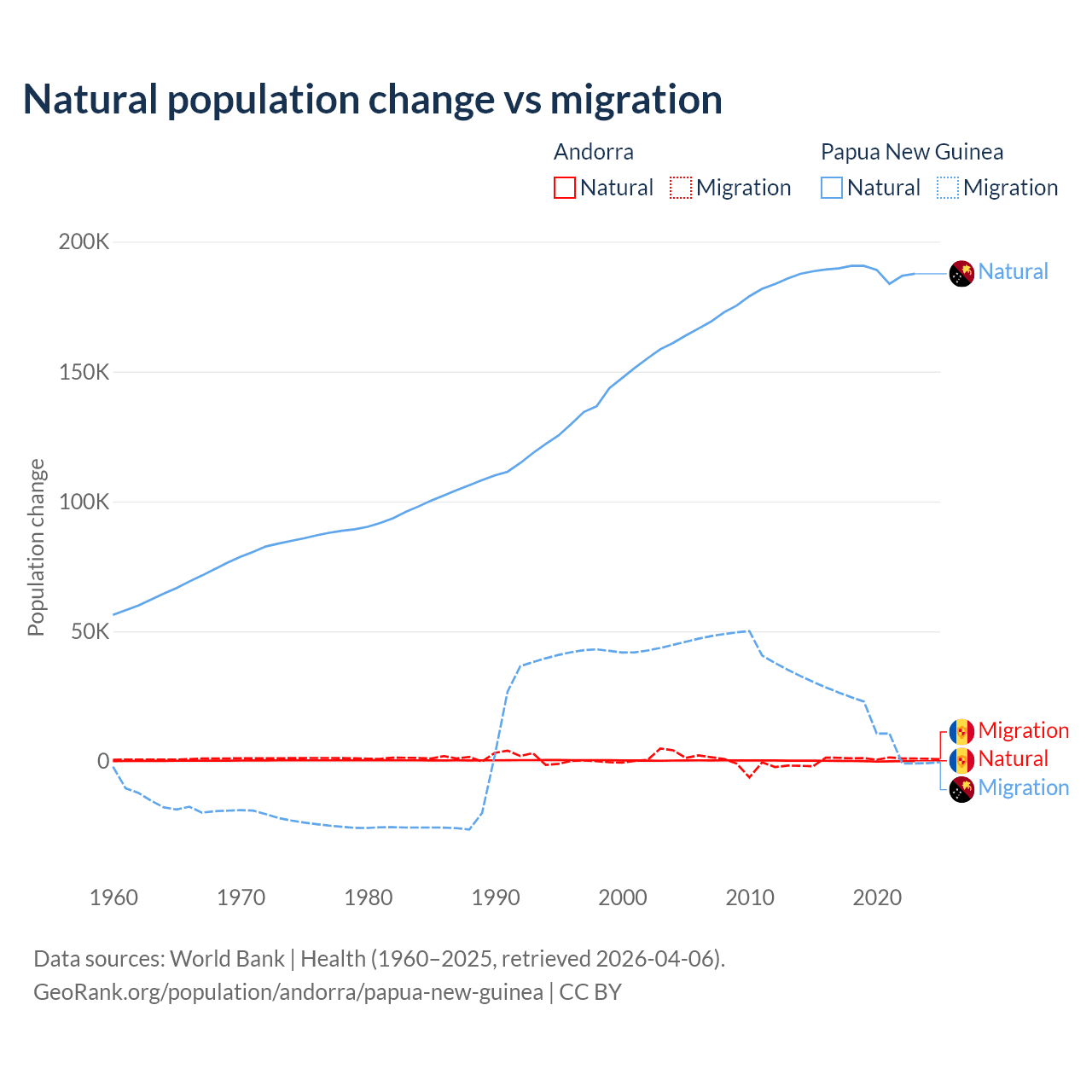 Over the last 10 years, 16.2% of the population change in Andorra is from natural causes (a gain of 1,123 people) and 83.8% is from migration (a gain of 5,802 people). In Papua New Guinea 91% is from natural causes (a gain of 1,883,906 people) and 8.98% is from migration (a gain of 185,900 people).