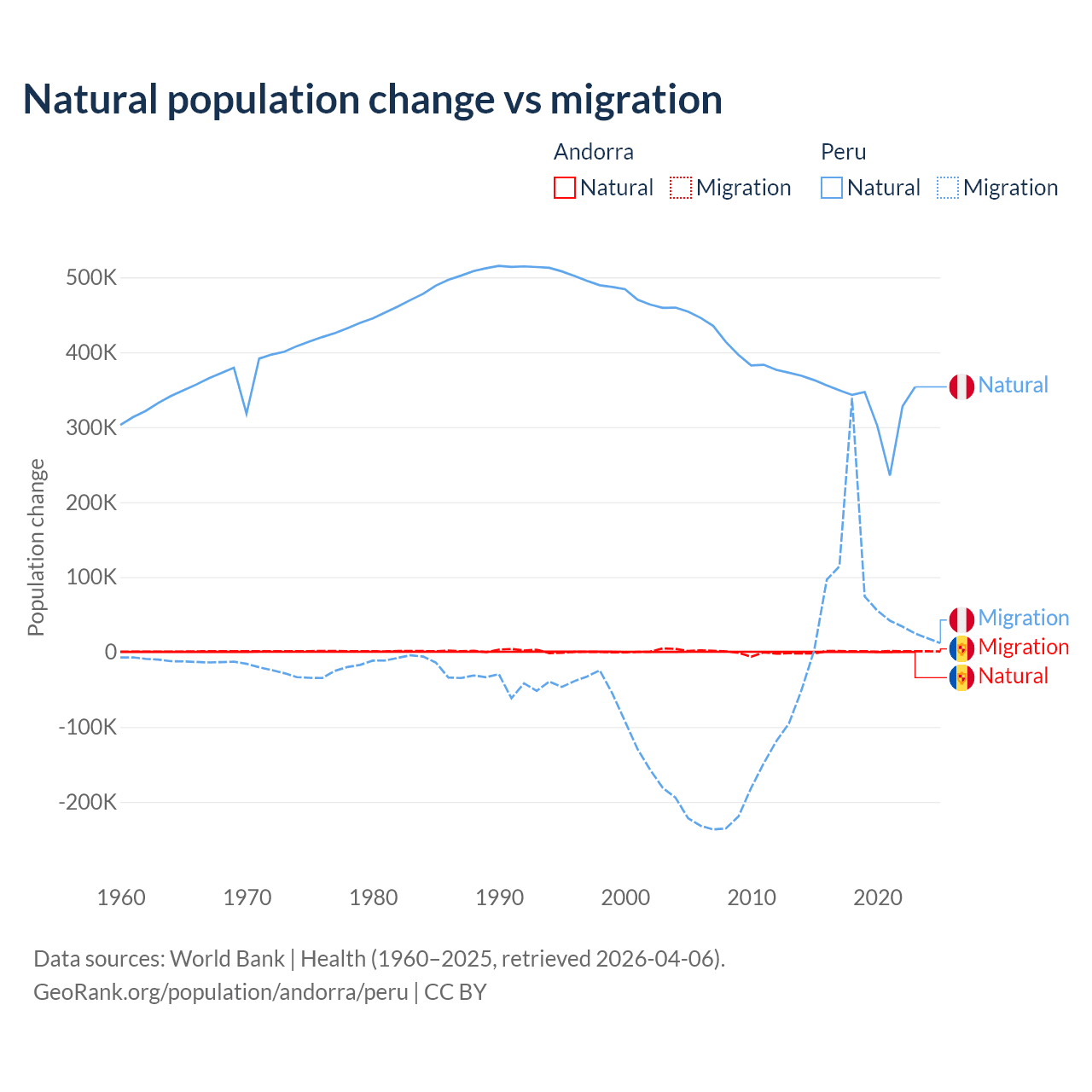 Over the last 10 years, 16.2% of the population change in Andorra is from natural causes (a gain of 1,123 people) and 83.8% is from migration (a gain of 5,802 people). In Peru 82% is from natural causes (a gain of 3,345,822 people) and 18% is from migration (a gain of 732,505 people).
