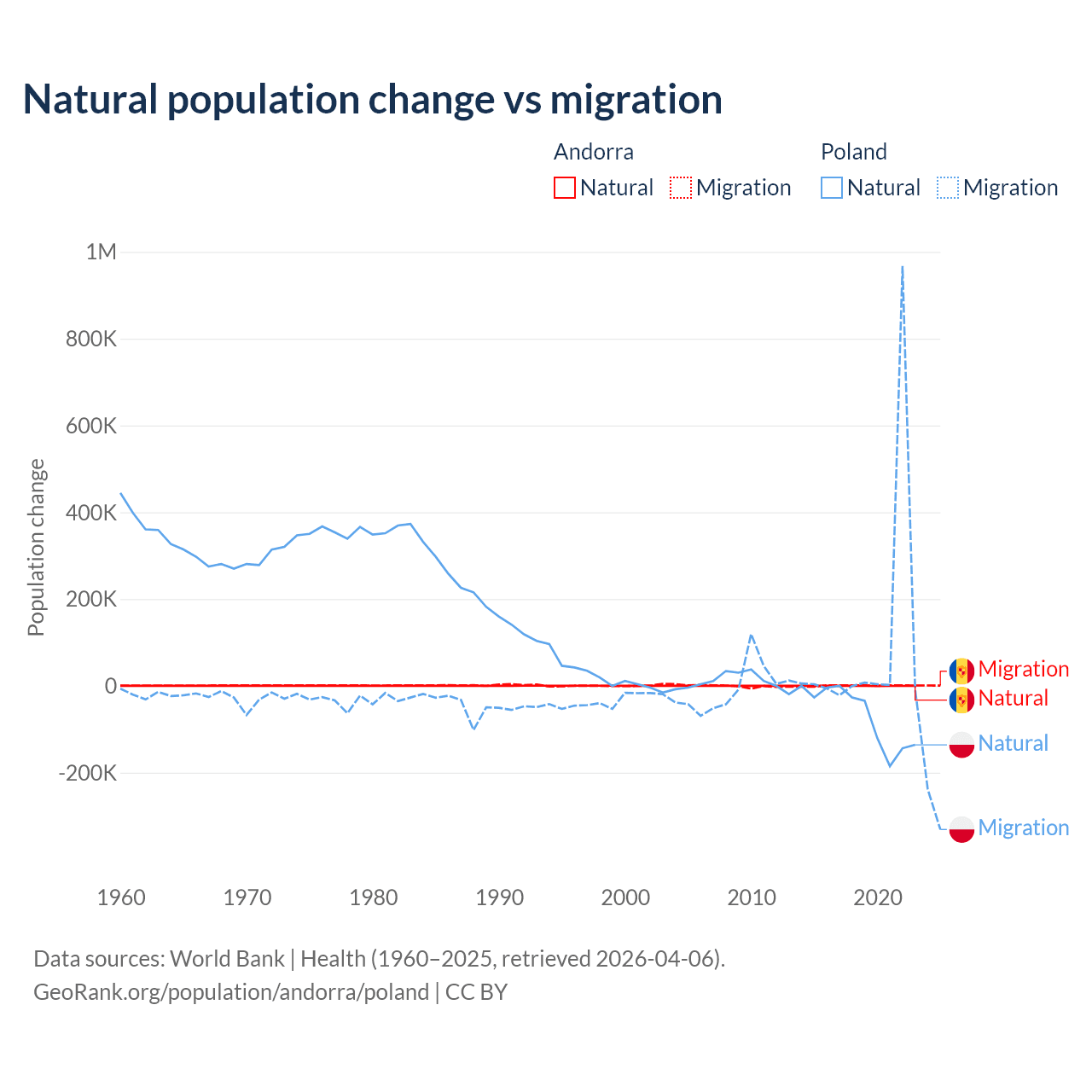 Over the last 10 years, 16.2% of the population change in Andorra is from natural causes (a gain of 1,123 people) and 83.8% is from migration (a gain of 5,802 people). In Poland 41.4% is from natural causes (a loss of 675,443 people) and 58.6% is from migration (a gain of 955,766 people).