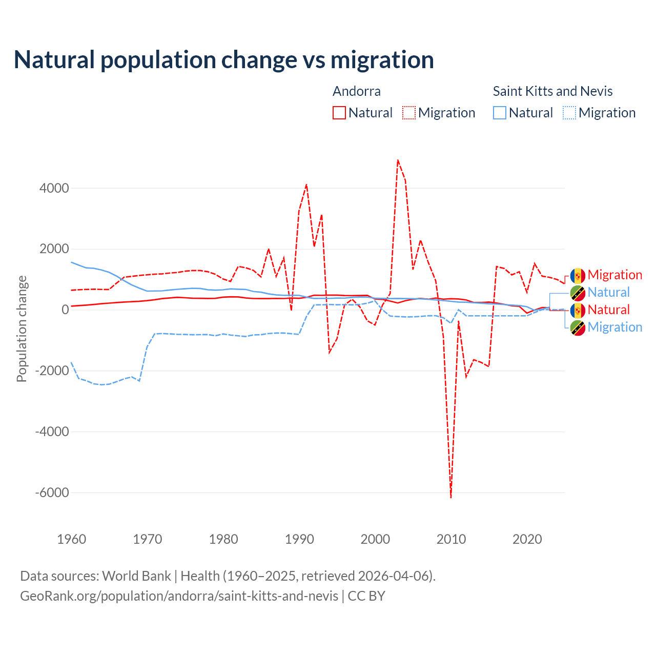 Over the last 10 years, 16.2% of the population change in Andorra is from natural causes (a gain of 1,123 people) and 83.8% is from migration (a gain of 5,802 people). In Saint Kitts and Nevis 44.9% is from natural causes (a gain of 1,225 people) and 55.1% is from migration (a loss of 1,506 people).