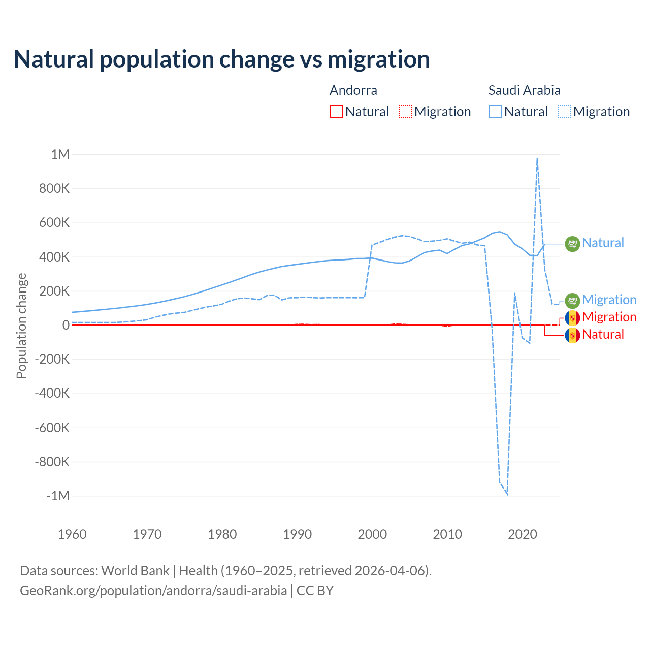 Over the last 10 years, 16.2% of the population change in Andorra is from natural causes (a gain of 1,123 people) and 83.8% is from migration (a gain of 5,802 people). In Saudi Arabia 93.9% is from natural causes (a gain of 4,829,562 people) and 6.05% is from migration (a gain of 311,209 people).