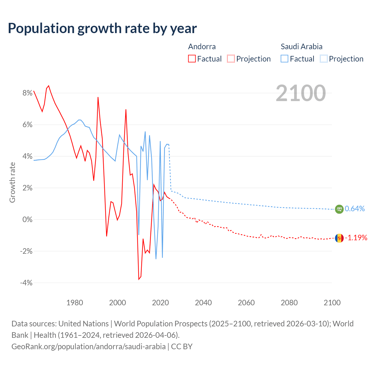 - For the last 10 years, Andorra has had an average growth rate of +0.79% per year vs +2.3% in Saudi Arabia.