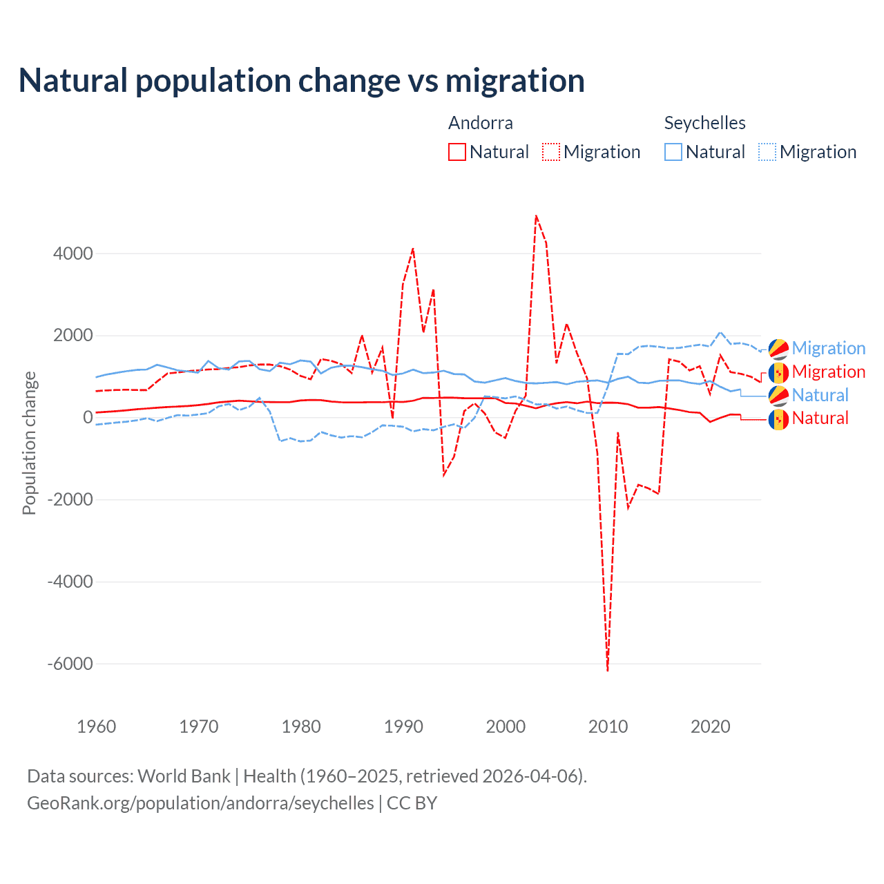 Over the last 10 years, 16.2% of the population change in Andorra is from natural causes (a gain of 1,123 people) and 83.8% is from migration (a gain of 5,802 people). In the Seychelles 31.4% is from natural causes (a gain of 8,122 people) and 68.6% is from migration (a gain of 17,748 people).