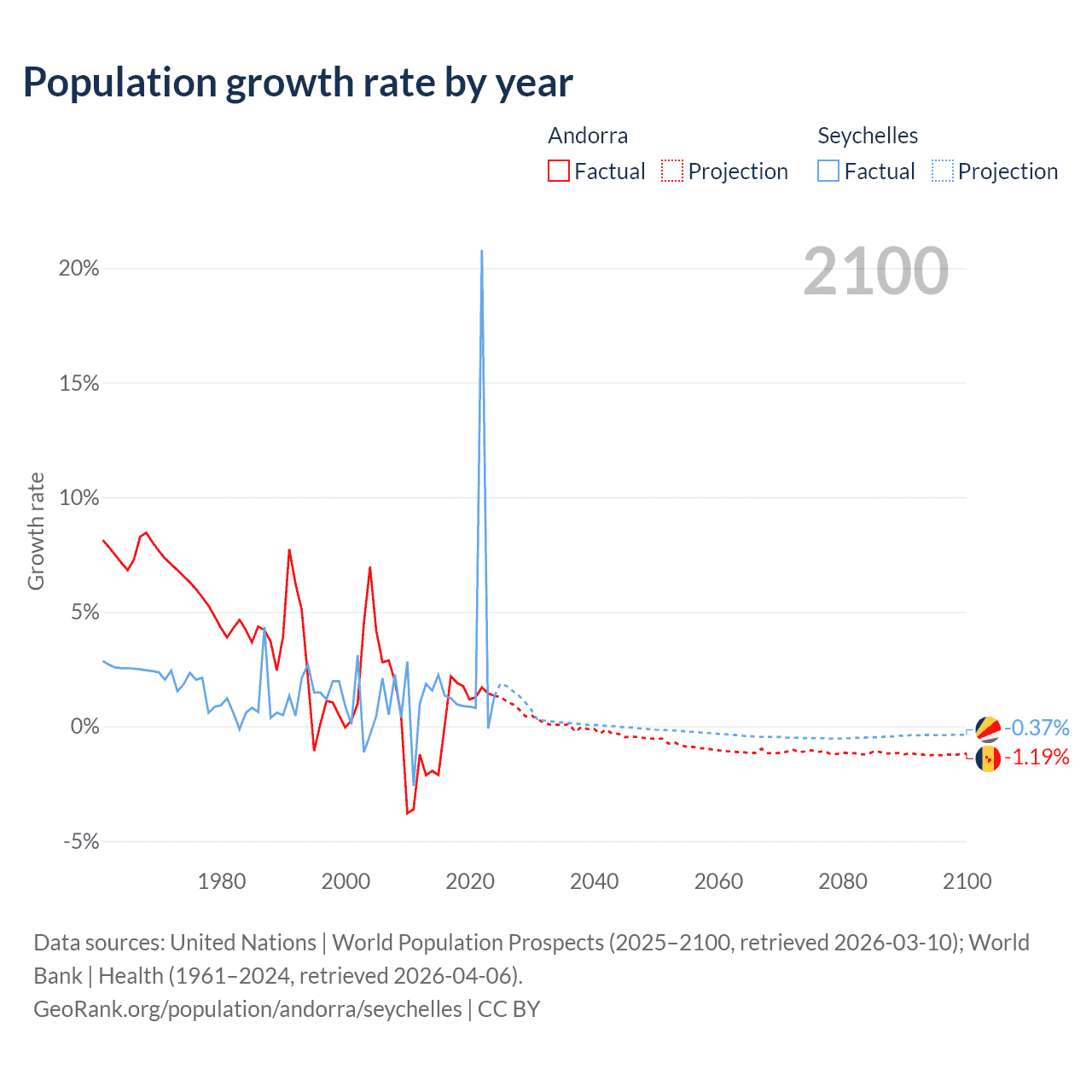 - For the last 10 years, Andorra has had an average growth rate of +0.79% per year vs +2.9% in the Seychelles.