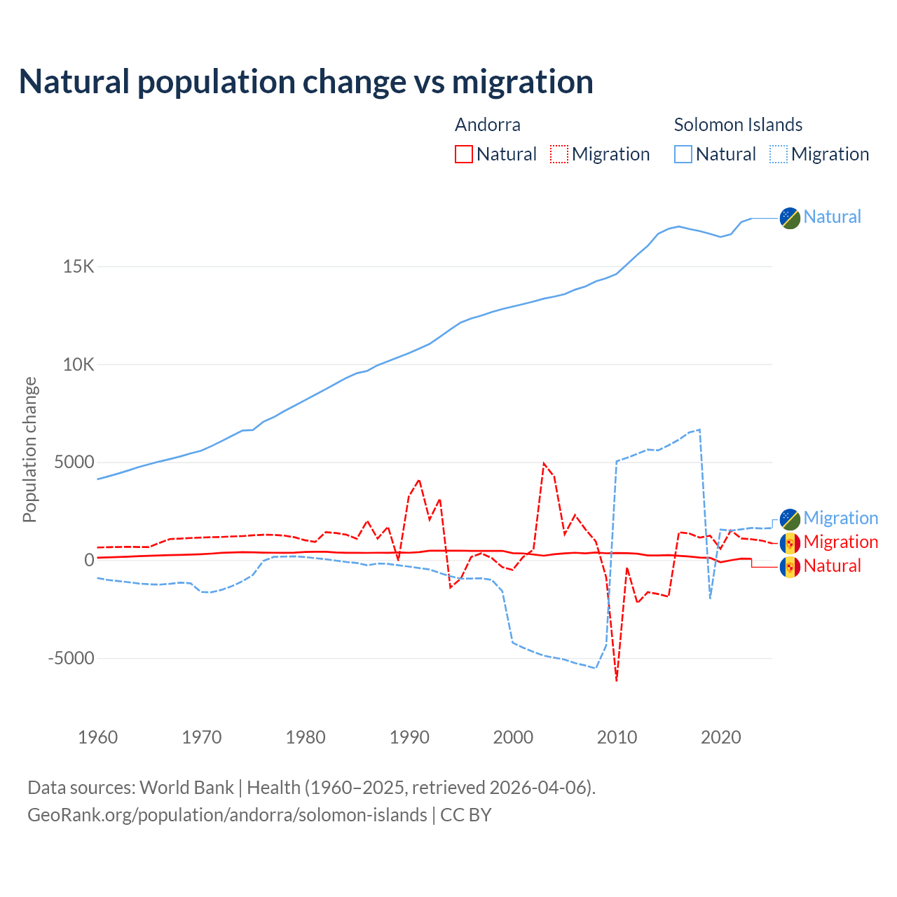 Over the last 10 years, 16.2% of the population change in Andorra is from natural causes (a gain of 1,123 people) and 83.8% is from migration (a gain of 5,802 people). In the Solomon Islands 82.8% is from natural causes (a gain of 168,727 people) and 17.2% is from migration (a gain of 35,031 people).