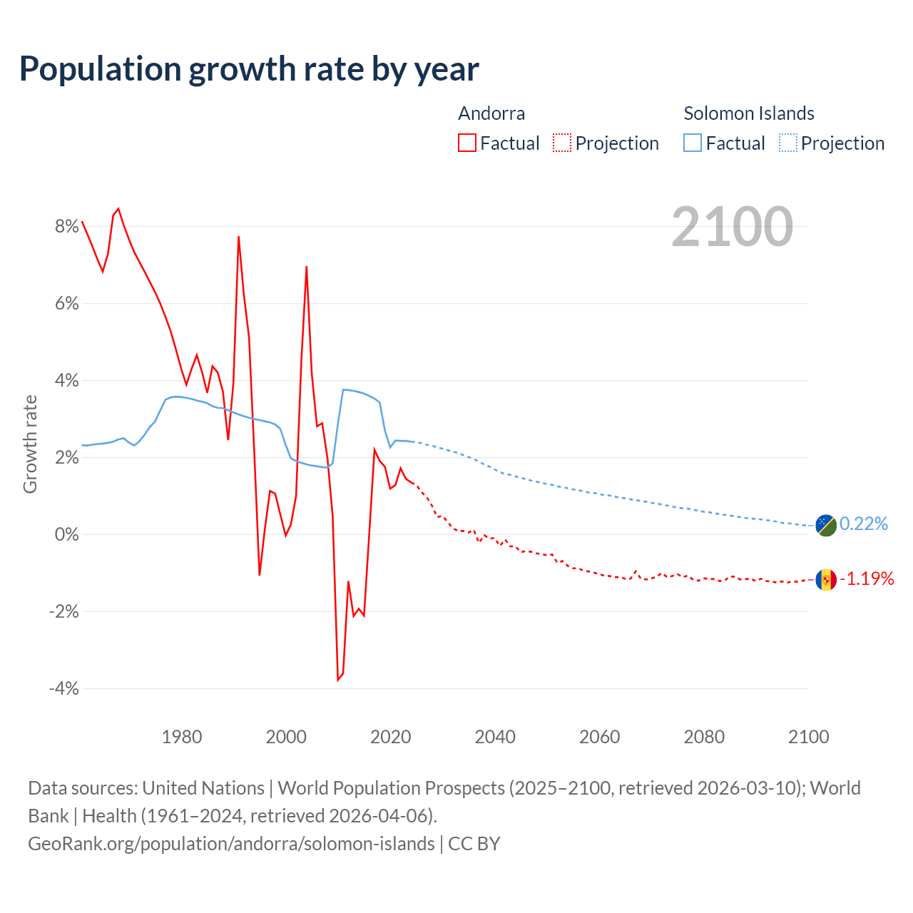 - For the last 10 years, Andorra has had an average growth rate of +0.79% per year vs +2.95% in the Solomon Islands.