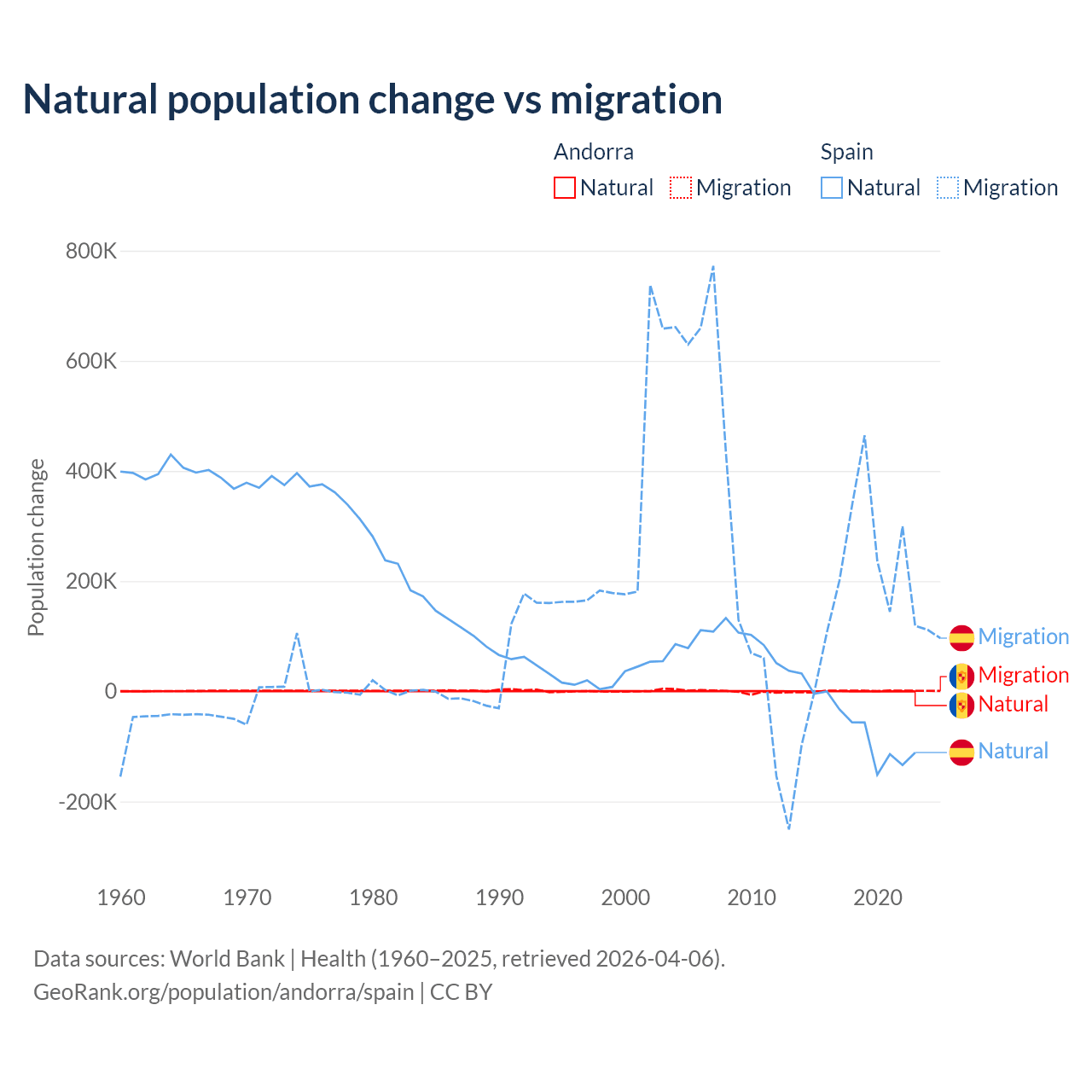 Over the last 10 years, 16.2% of the population change in Andorra is from natural causes (a gain of 1,123 people) and 83.8% is from migration (a gain of 5,802 people). In Spain 25.8% is from natural causes (a loss of 627,829 people) and 74.2% is from migration (a gain of 1,810,127 people).