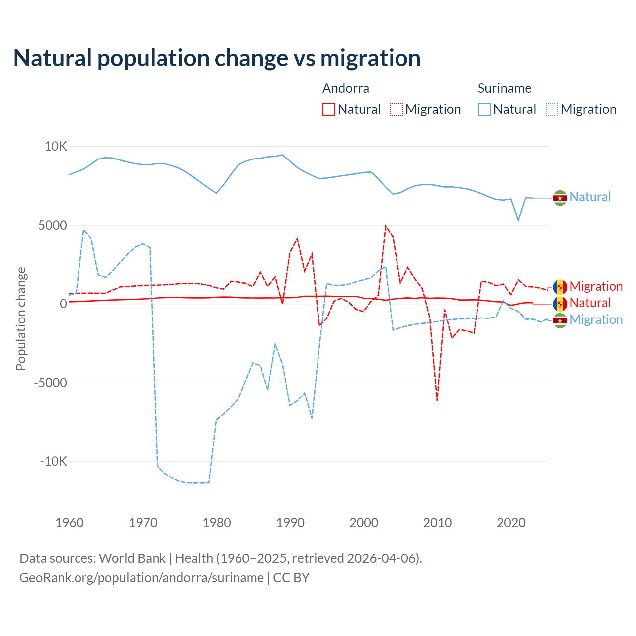 Over the last 10 years, 16.2% of the population change in Andorra is from natural causes (a gain of 1,123 people) and 83.8% is from migration (a gain of 5,802 people). In Suriname 90.3% is from natural causes (a gain of 66,709 people) and 9.72% is from migration (a loss of 7,185 people).
