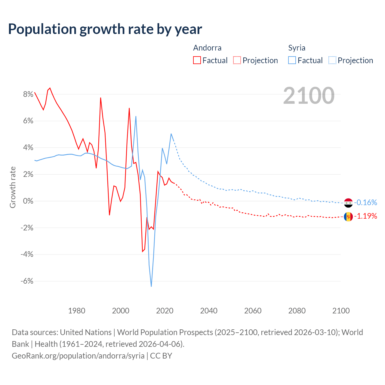 - For the last 10 years, Andorra has had an average growth rate of +0.79% per year vs +1.25% in Syria.