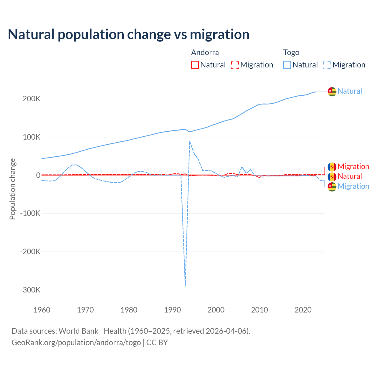 Over the last 10 years, 16.2% of the population change in Andorra is from natural causes (a gain of 1,123 people) and 83.8% is from migration (a gain of 5,802 people). In Togo 99.1% is from natural causes (a gain of 2,052,115 people) and 0.86% is from migration (a loss of 17,852 people).