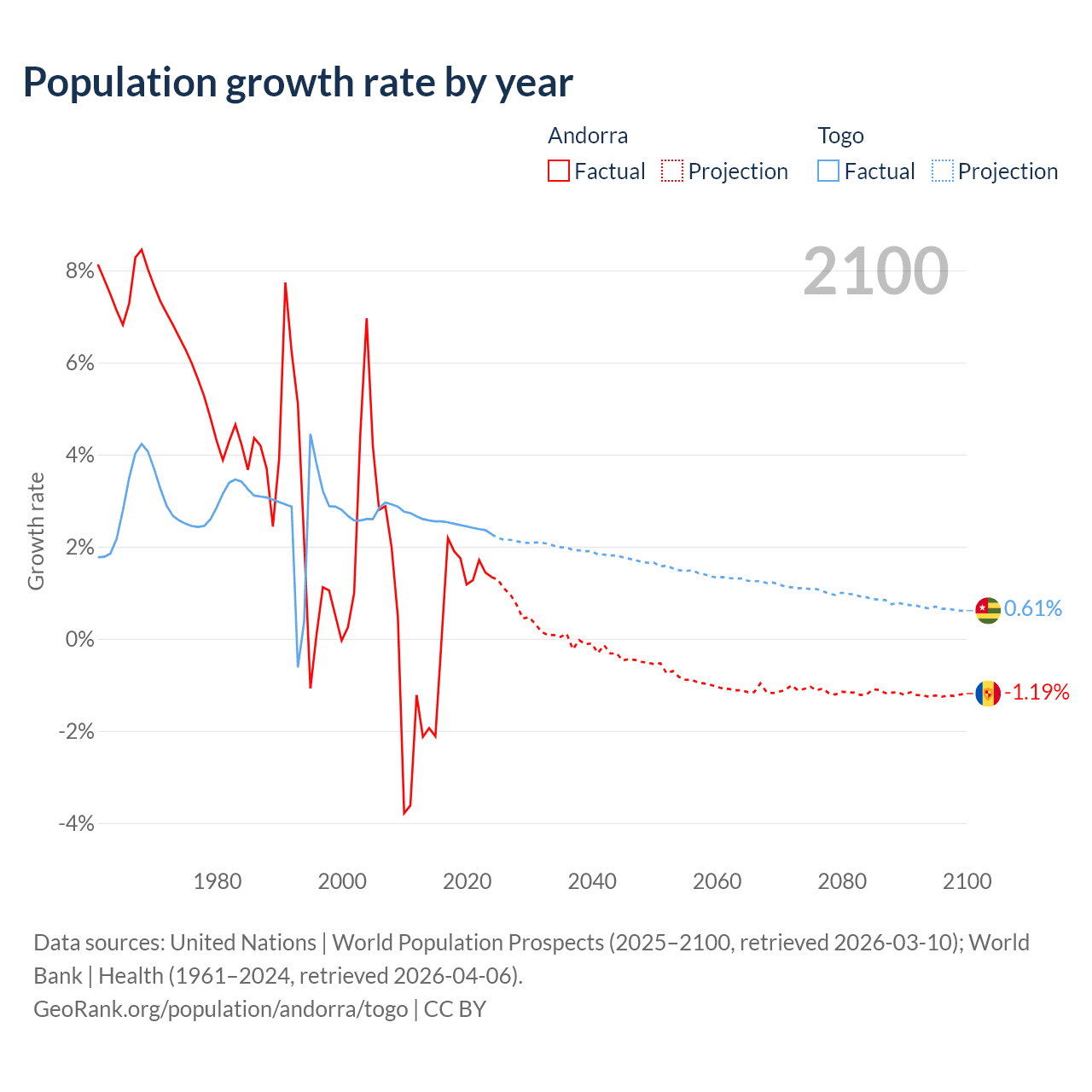 - For the last 10 years, Andorra has had an average growth rate of +0.79% per year vs +2.46% in Togo.