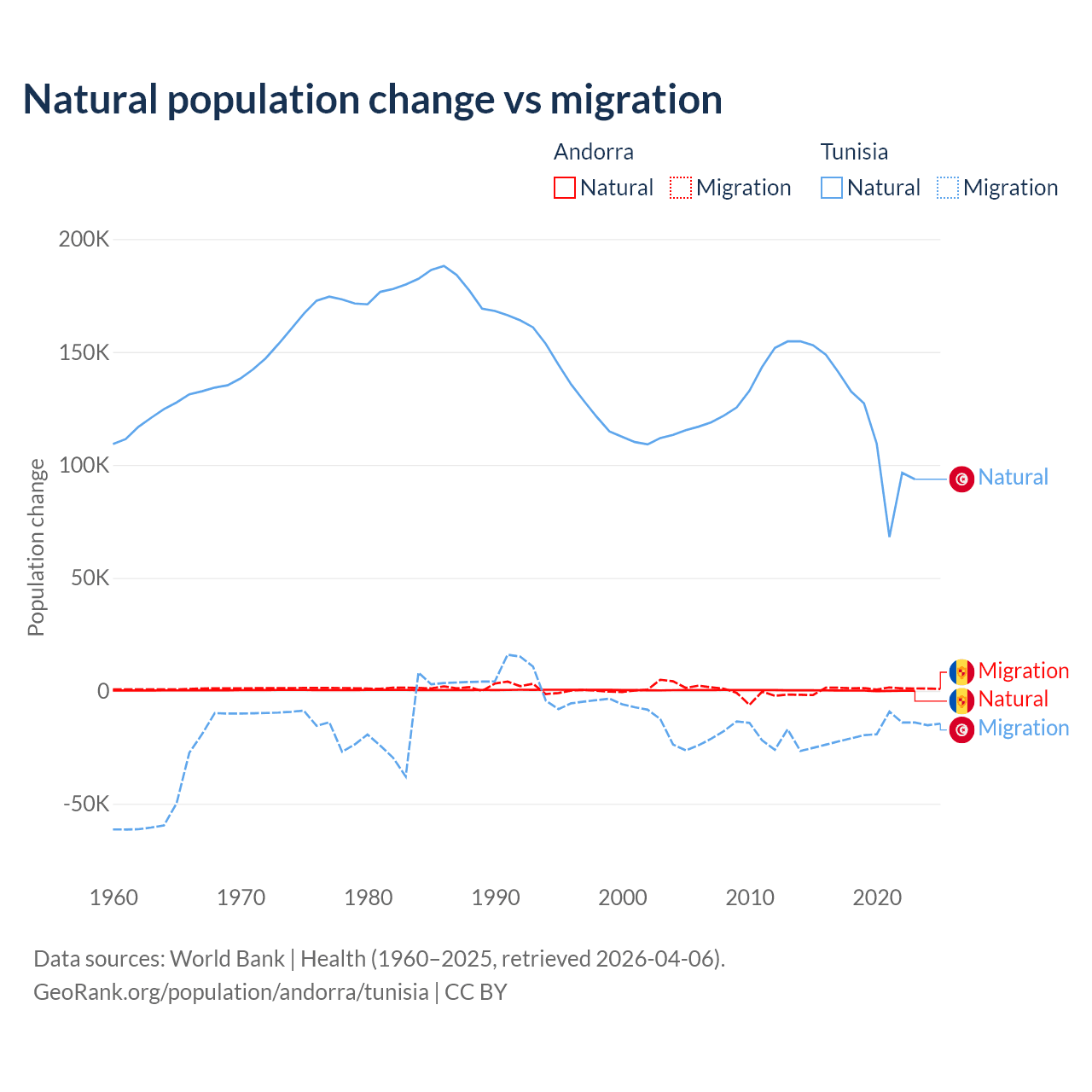 Over the last 10 years, 16.2% of the population change in Andorra is from natural causes (a gain of 1,123 people) and 83.8% is from migration (a gain of 5,802 people). In Tunisia 86.3% is from natural causes (a gain of 1,225,079 people) and 13.7% is from migration (a loss of 195,011 people).