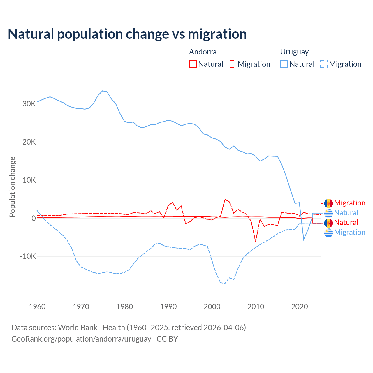Over the last 10 years, 16.2% of the population change in Andorra is from natural causes (a gain of 1,123 people) and 83.8% is from migration (a gain of 5,802 people). In Uruguay 70% is from natural causes (a gain of 64,303 people) and 30% is from migration (a loss of 27,501 people).