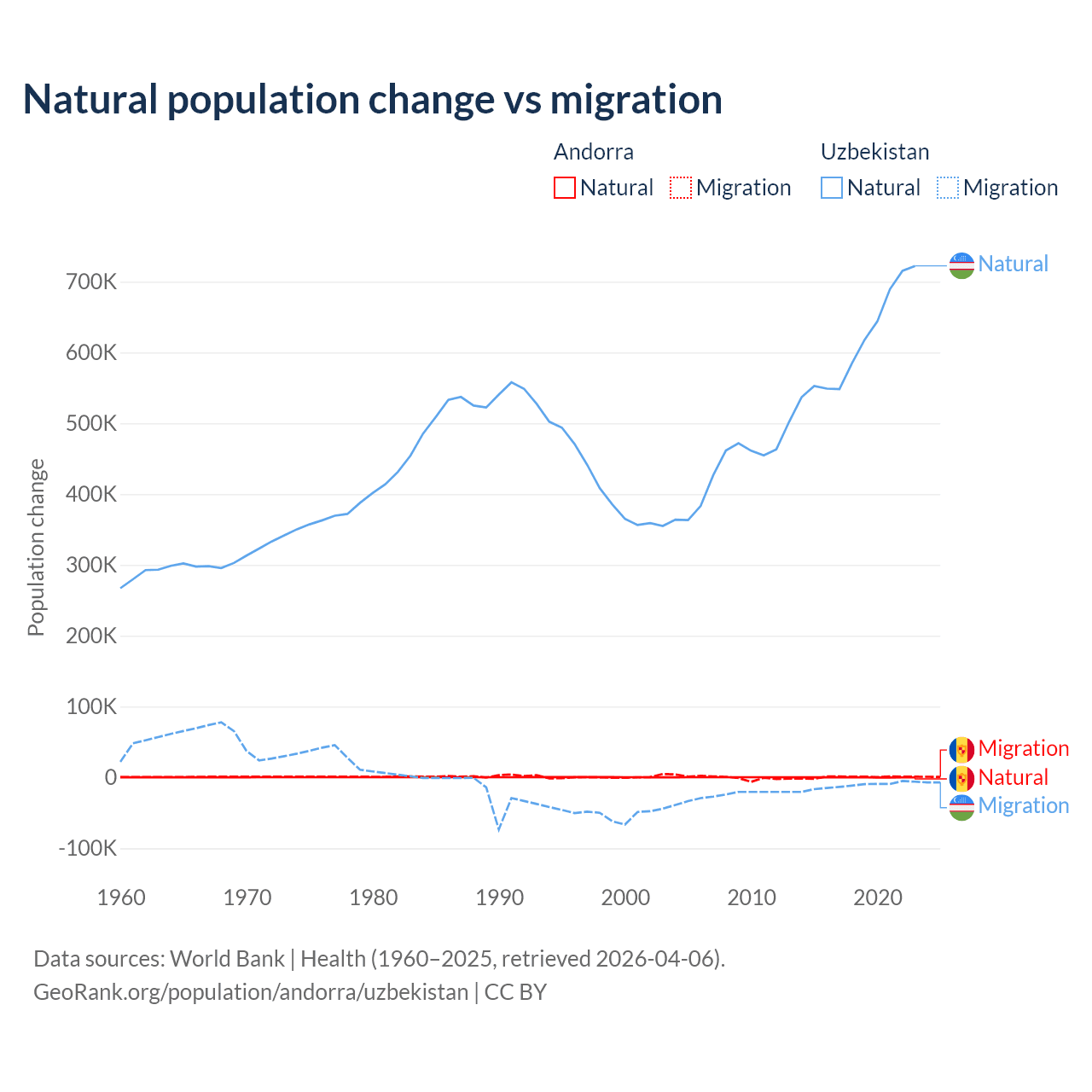 Over the last 10 years, 16.2% of the population change in Andorra is from natural causes (a gain of 1,123 people) and 83.8% is from migration (a gain of 5,802 people). In Uzbekistan 98.2% is from natural causes (a gain of 6,161,117 people) and 1.84% is from migration (a loss of 115,398 people).