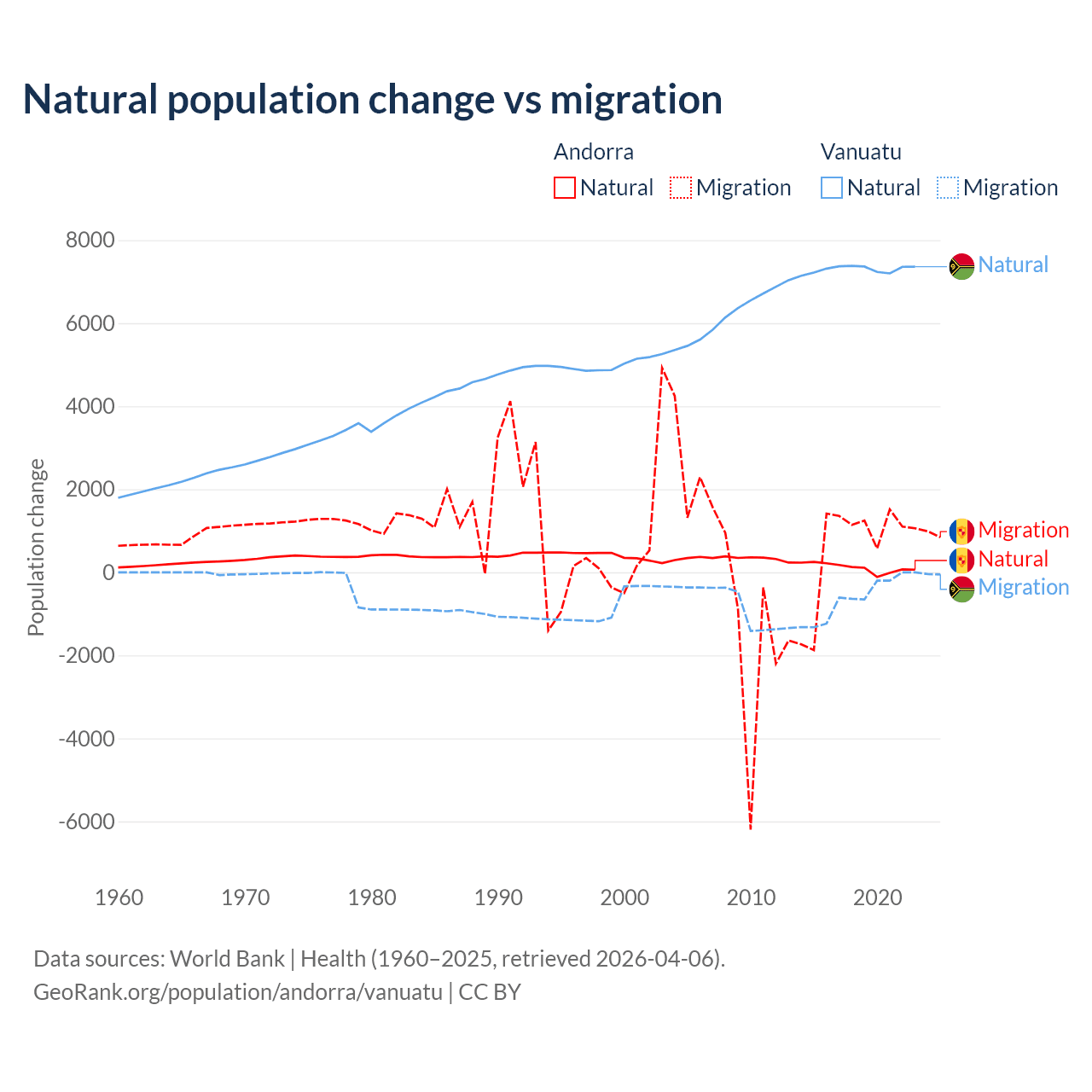 Over the last 10 years, 16.2% of the population change in Andorra is from natural causes (a gain of 1,123 people) and 83.8% is from migration (a gain of 5,802 people). In Vanuatu 92.2% is from natural causes (a gain of 72,941 people) and 7.81% is from migration (a loss of 6,181 people).