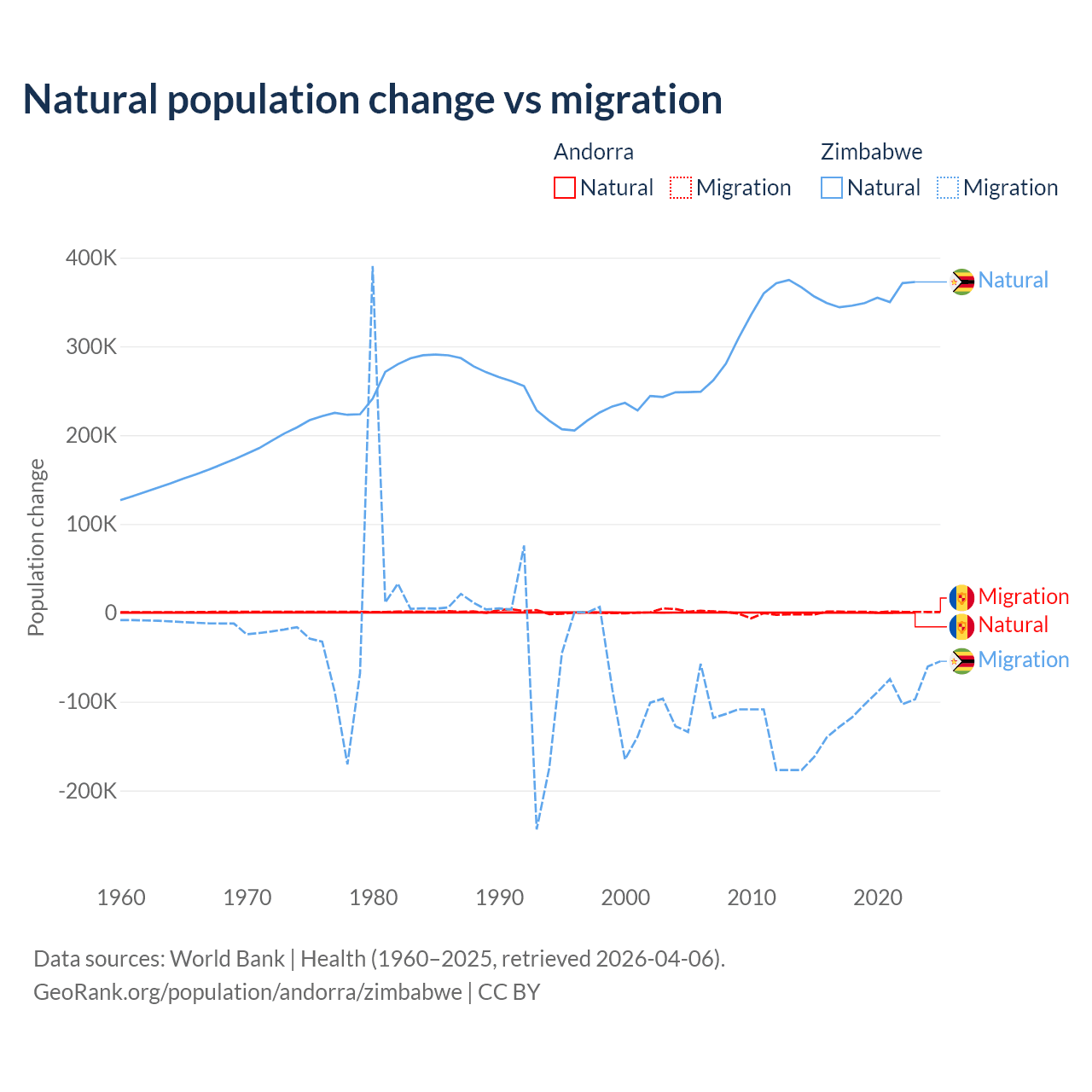 Over the last 10 years, 16.2% of the population change in Andorra is from natural causes (a gain of 1,123 people) and 83.8% is from migration (a gain of 5,802 people). In Zimbabwe 74.9% is from natural causes (a gain of 3,558,487 people) and 25.1% is from migration (a loss of 1,192,807 people).