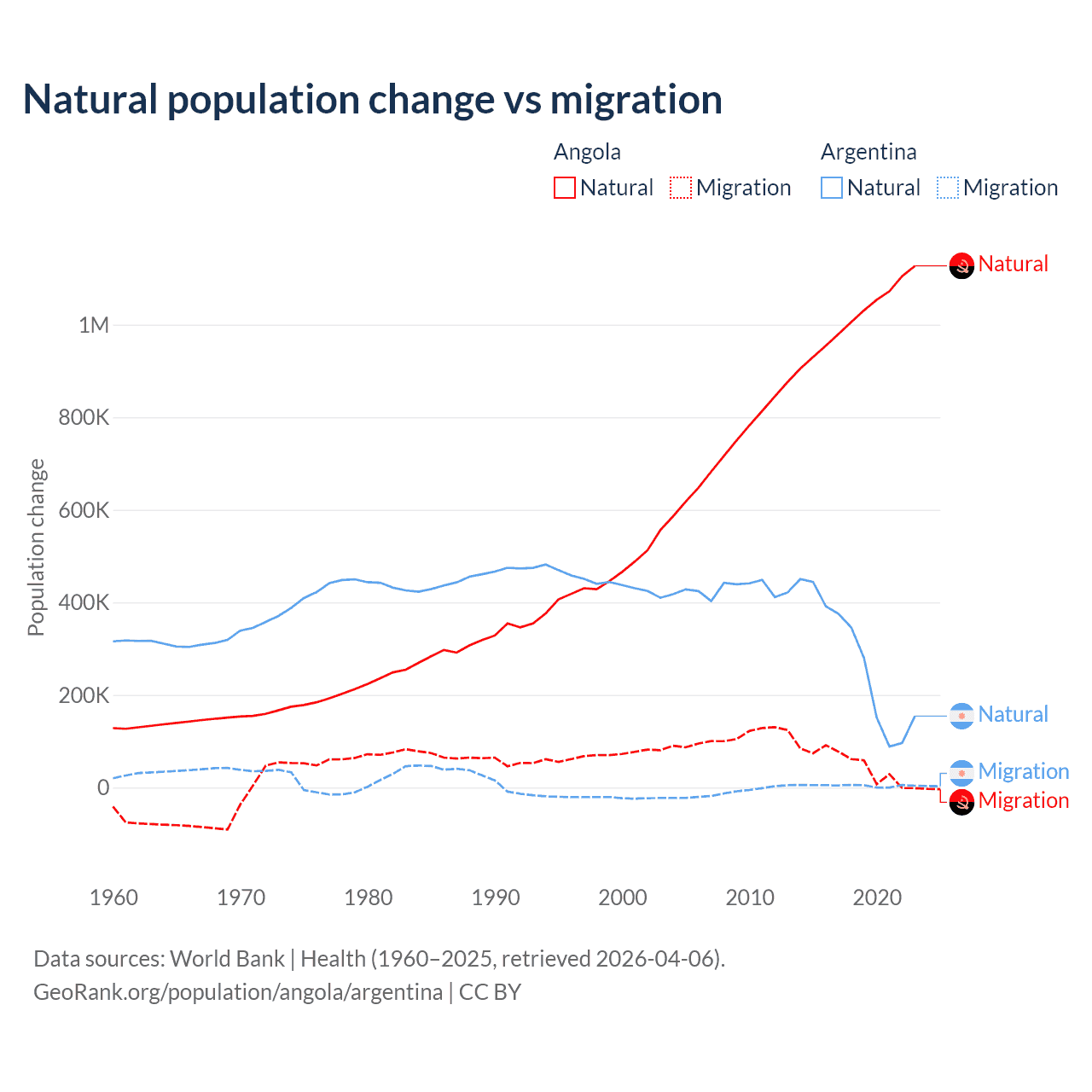 Over the last 10 years, 95.5% of the population change in Angola is from natural causes (a gain of 10,163,567 people) and 4.54% is from migration (a gain of 483,327 people). In Argentina 98.5% is from natural causes (a gain of 2,779,031 people) and 1.52% is from migration (a gain of 42,871 people).