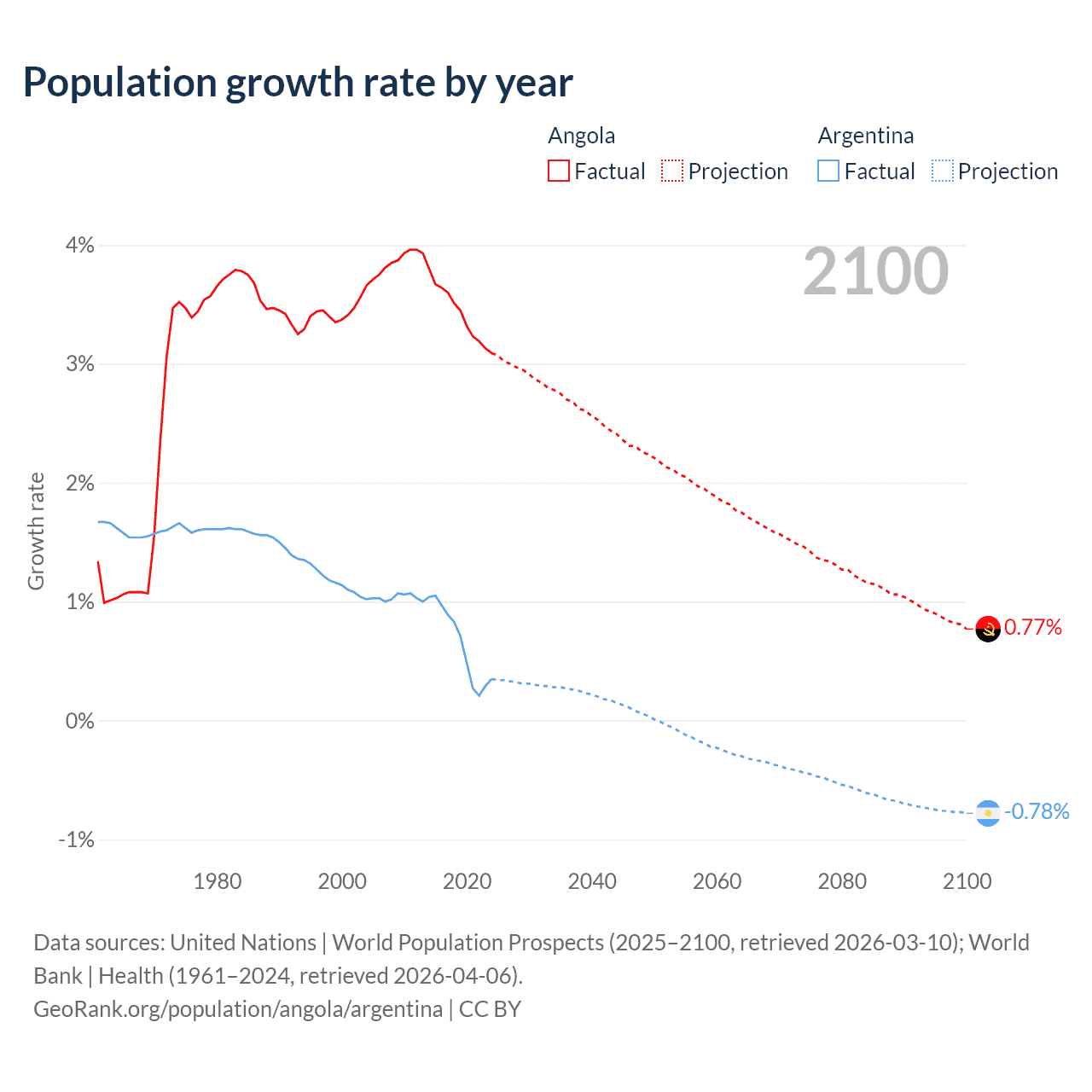 - For the last 10 years, Angola has had an average growth rate of +3.42% per year vs +0.64% in Argentina.