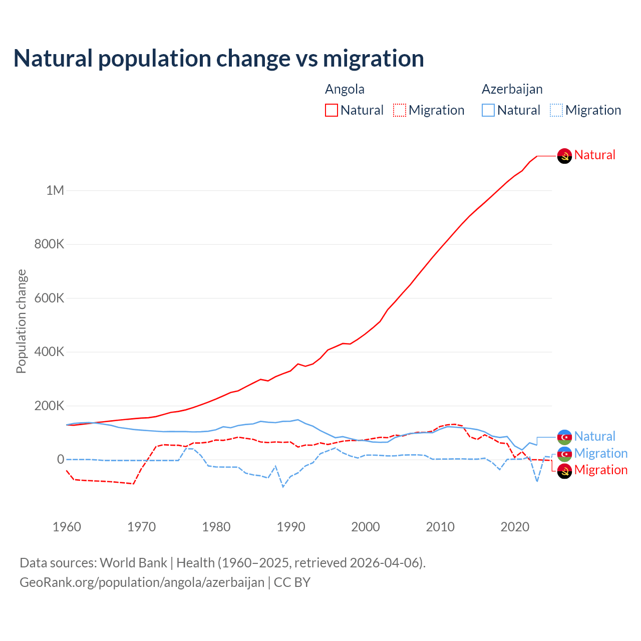 Over the last 10 years, 95.5% of the population change in Angola is from natural causes (a gain of 10,163,567 people) and 4.54% is from migration (a gain of 483,327 people). In Azerbaijan 87.2% is from natural causes (a gain of 782,840 people) and 12.8% is from migration (a loss of 114,572 people).