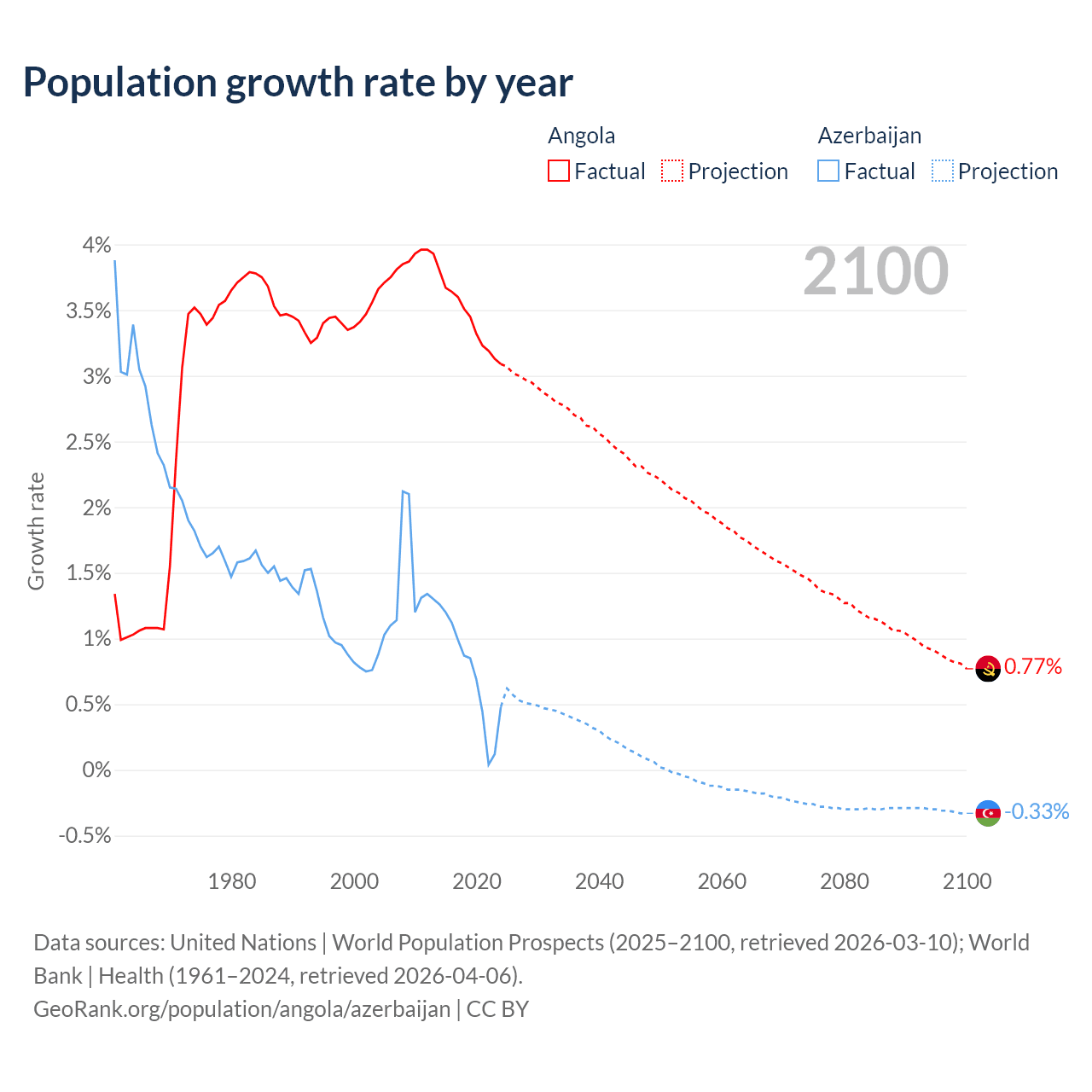 - For the last 10 years, Angola has had an average growth rate of +3.42% per year vs +0.73% in Azerbaijan.