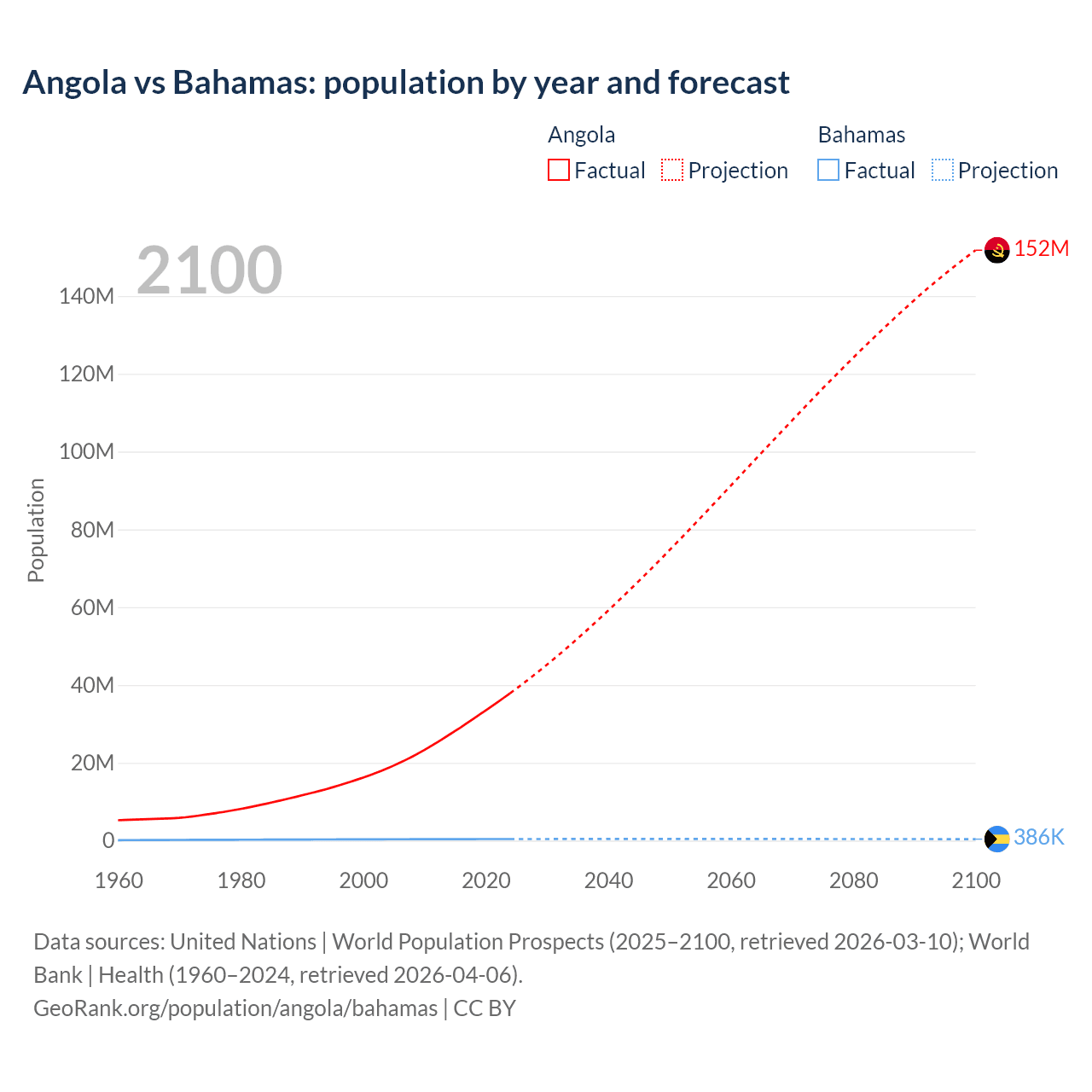 The latest officially reported population of Angola was 37,885,849 in 2024 vs 401,283 people in the Bahamas in 2024. In 2026, based on the adjusted UN estimation, the current Angola's population is 40,555,924 people compared to 405,203 in the Bahamas.