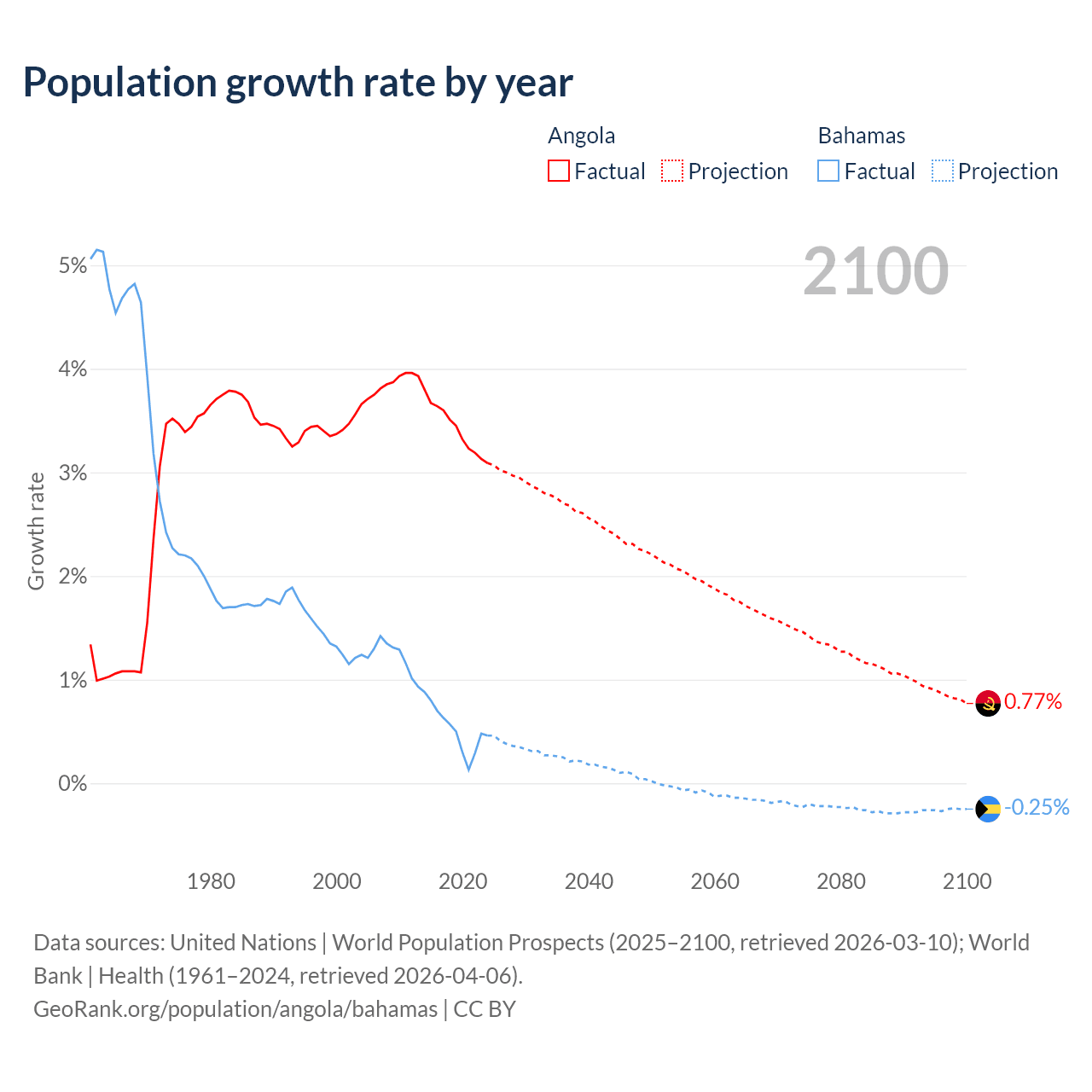 - For the last 10 years, Angola has had an average growth rate of +3.42% per year vs +0.52% in the Bahamas.