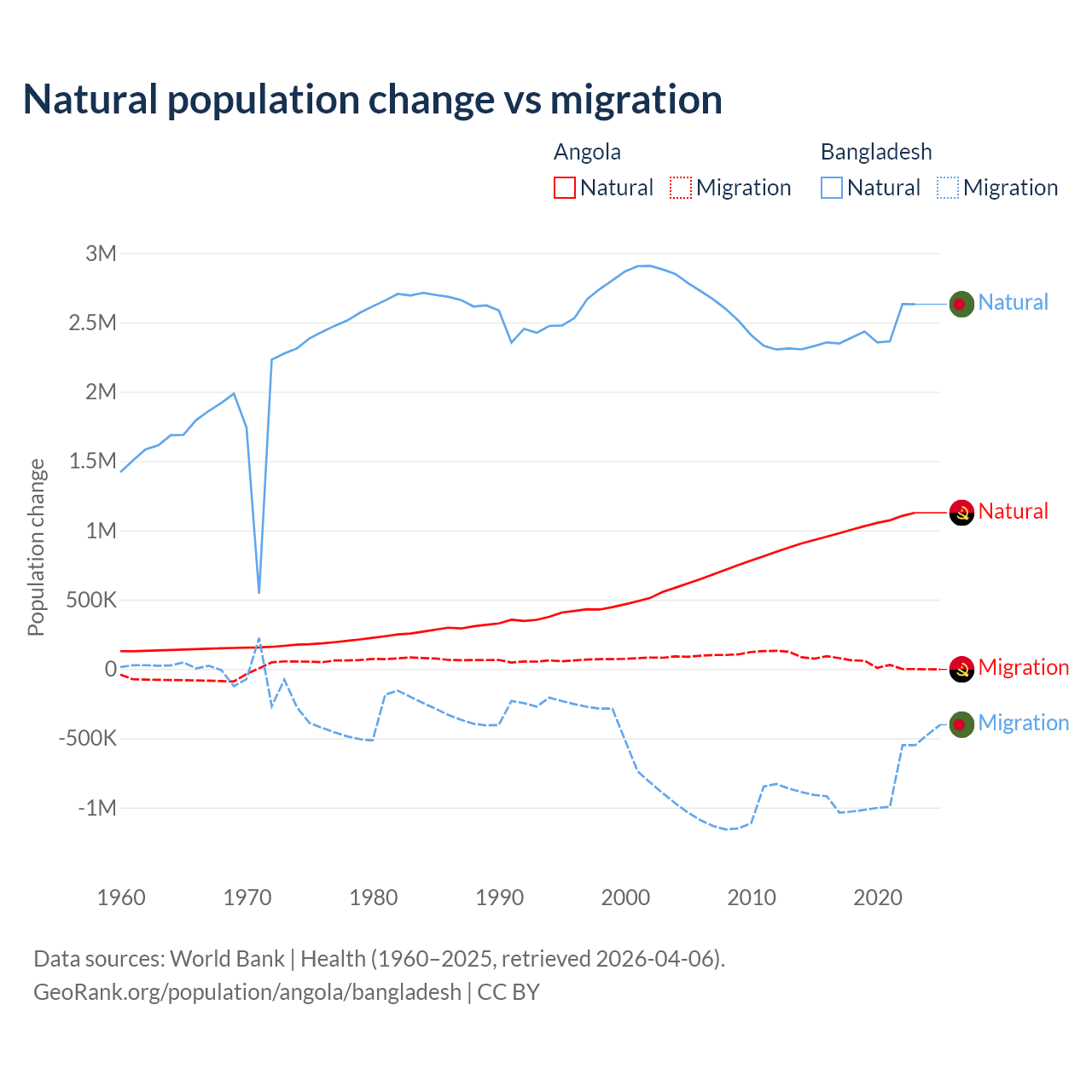 Over the last 10 years, 95.5% of the population change in Angola is from natural causes (a gain of 10,163,567 people) and 4.54% is from migration (a gain of 483,327 people). In Bangladesh 73.1% is from natural causes (a gain of 24,148,039 people) and 26.9% is from migration (a loss of 8,897,408 people).