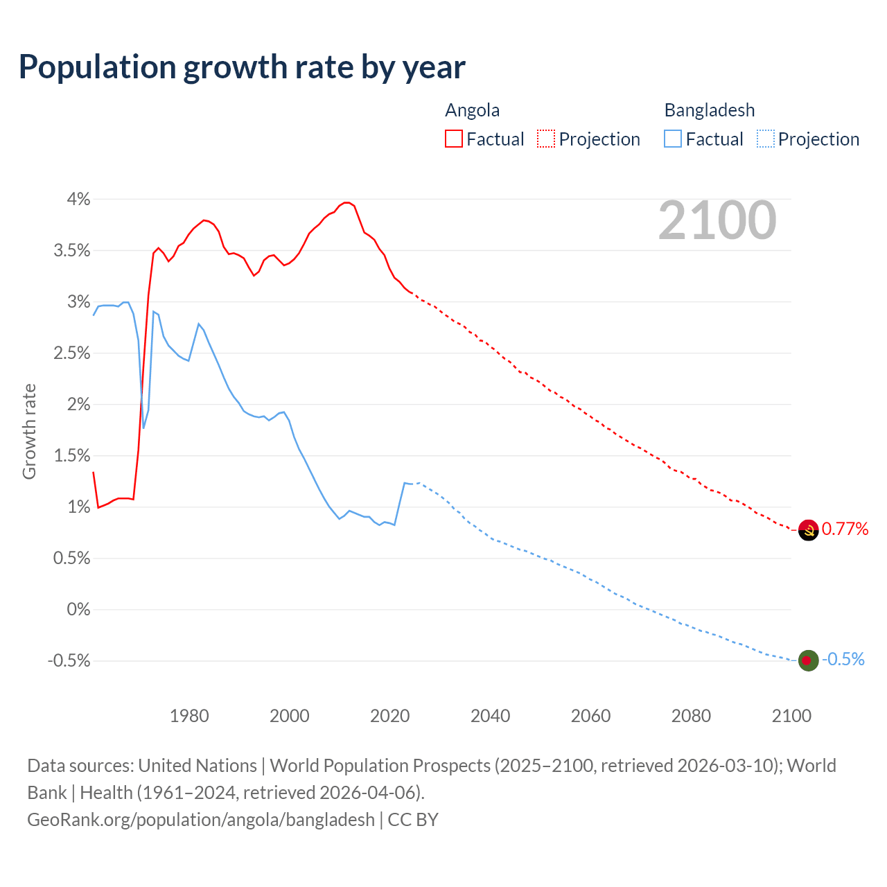 - For the last 10 years, Angola has had an average growth rate of +3.42% per year vs +0.94% in Bangladesh.