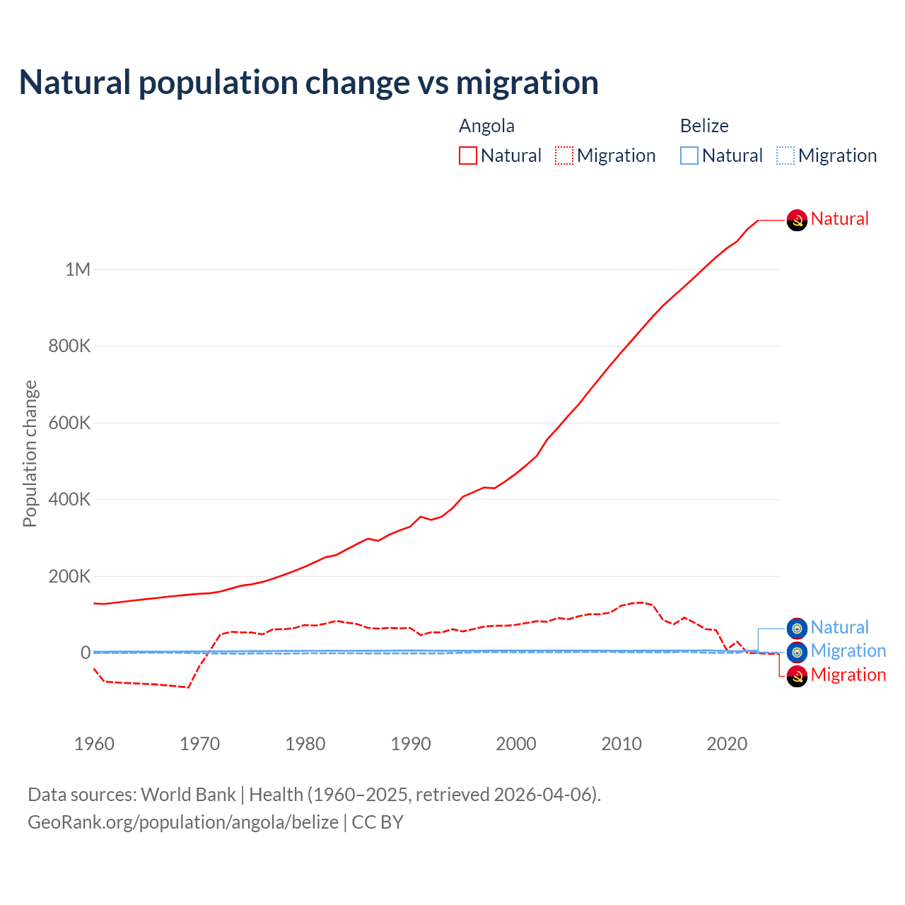Over the last 10 years, 95.5% of the population change in Angola is from natural causes (a gain of 10,163,567 people) and 4.54% is from migration (a gain of 483,327 people). In Belize 79.6% is from natural causes (a gain of 54,754 people) and 20.4% is from migration (a gain of 14,073 people).