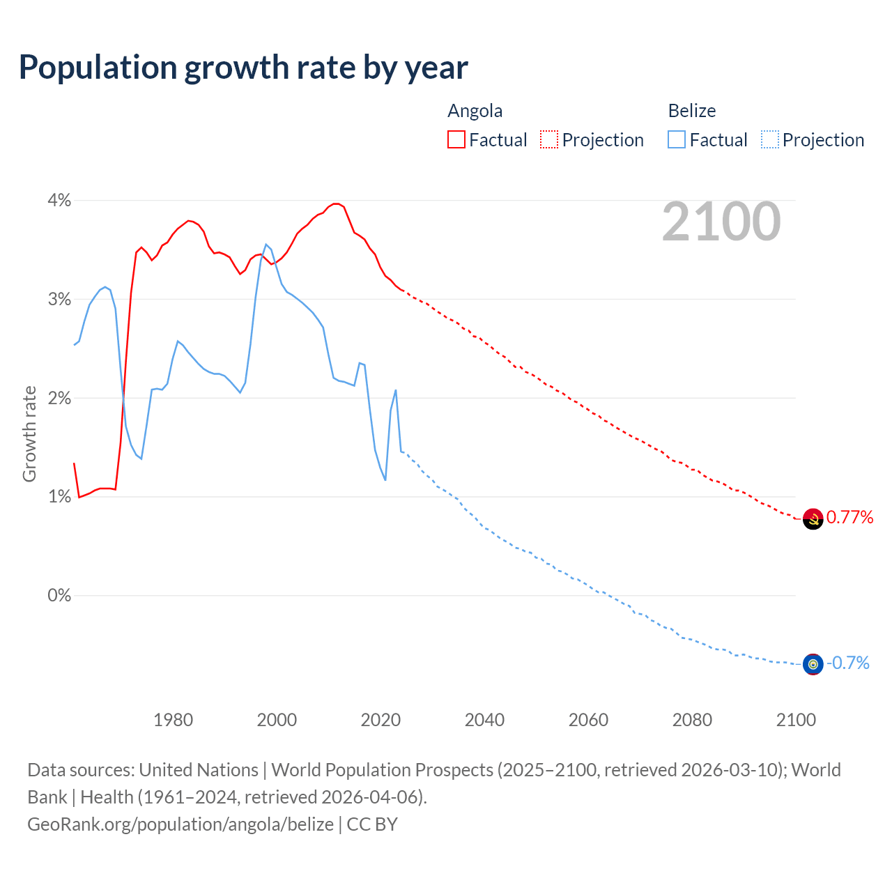 - For the last 10 years, Angola has had an average growth rate of +3.42% per year vs +1.83% in Belize.