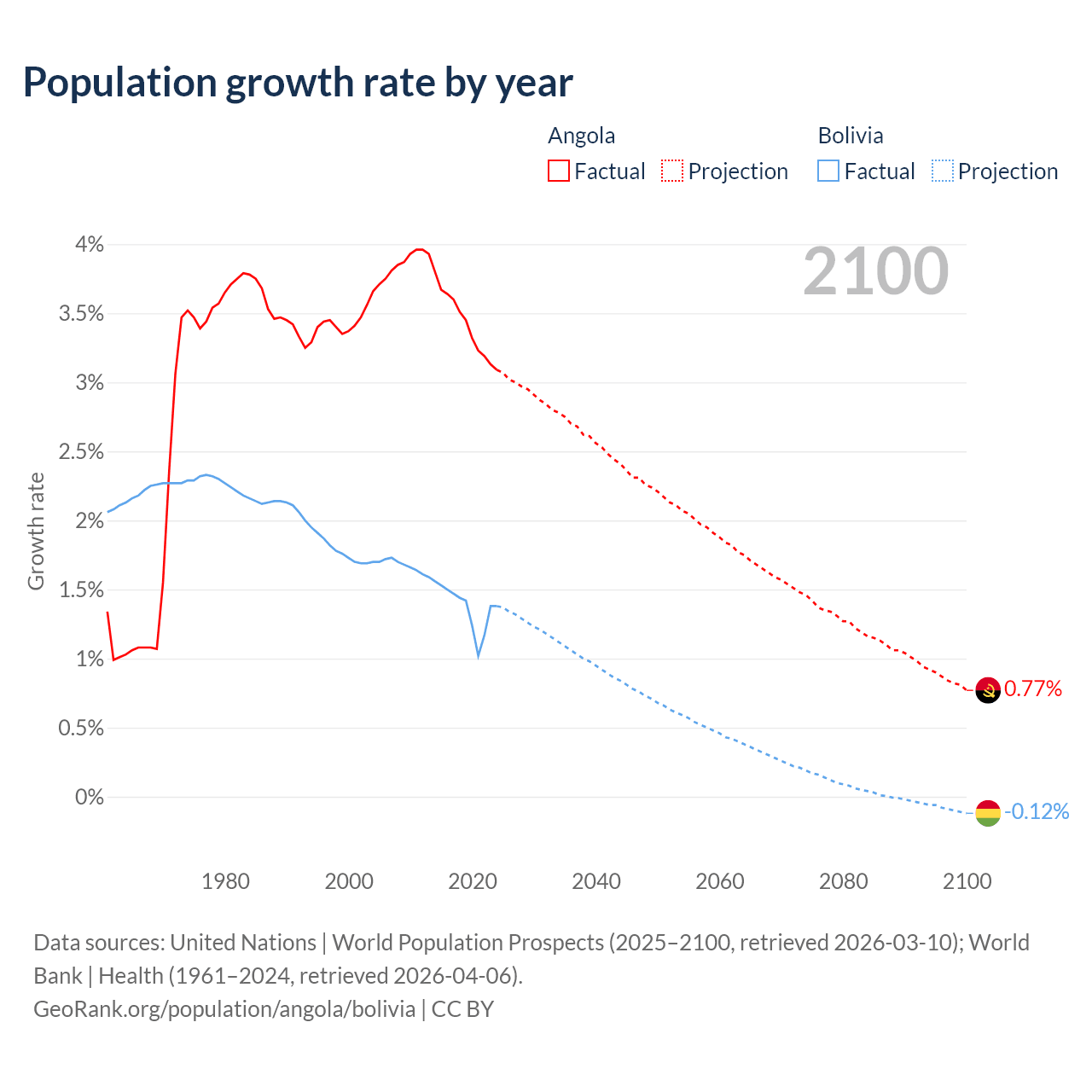 - For the last 10 years, Angola has had an average growth rate of +3.42% per year vs +1.37% in Bolivia.