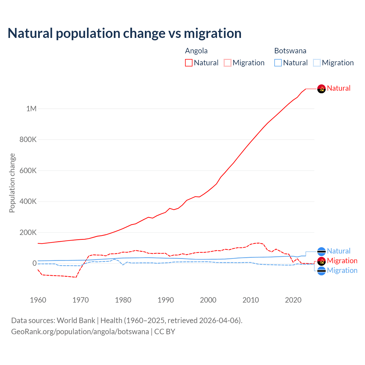 Over the last 10 years, 95.5% of the population change in Angola is from natural causes (a gain of 10,163,567 people) and 4.54% is from migration (a gain of 483,327 people). In Botswana 82.5% is from natural causes (a gain of 436,373 people) and 17.5% is from migration (a loss of 92,293 people).