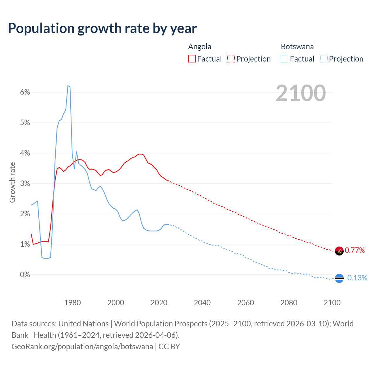 - For the last 10 years, Angola has had an average growth rate of +3.42% per year vs +1.5% in Botswana.