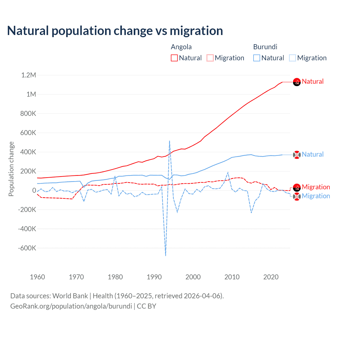 Over the last 10 years, 95.5% of the population change in Angola is from natural causes (a gain of 10,163,567 people) and 4.54% is from migration (a gain of 483,327 people). In Burundi 91% is from natural causes (a gain of 3,614,502 people) and 9.03% is from migration (a loss of 358,928 people).