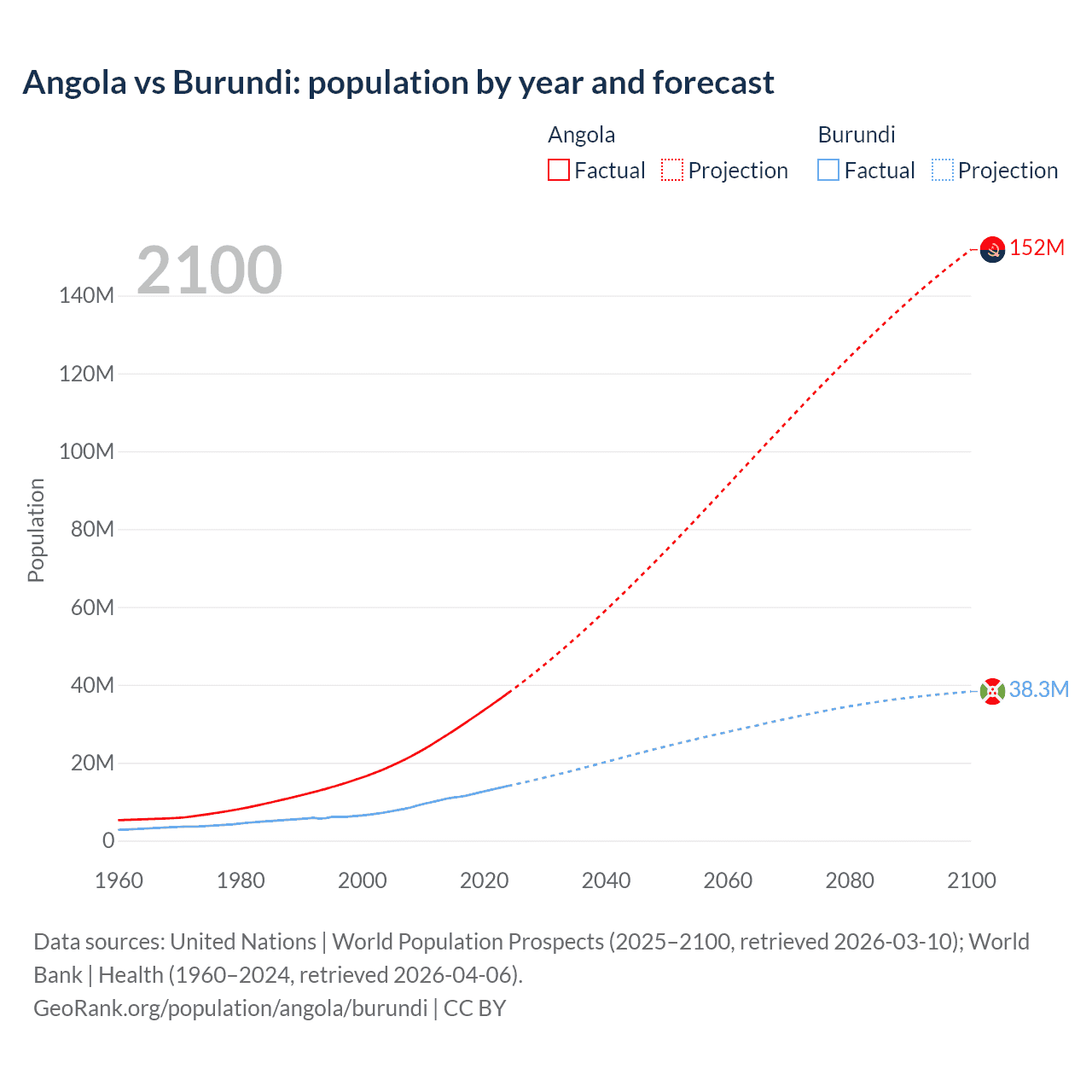Angola vs Burundi: population by year and forecast