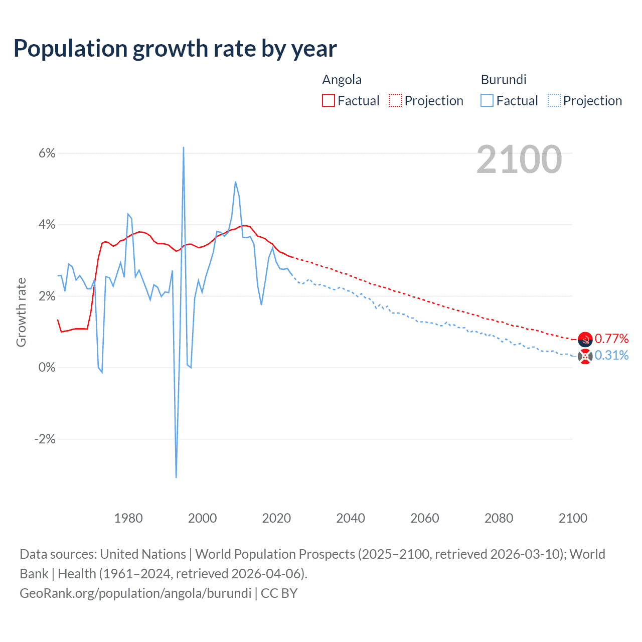 - For the last 10 years, Angola has had an average growth rate of +3.42% per year vs +2.74% in Burundi.
