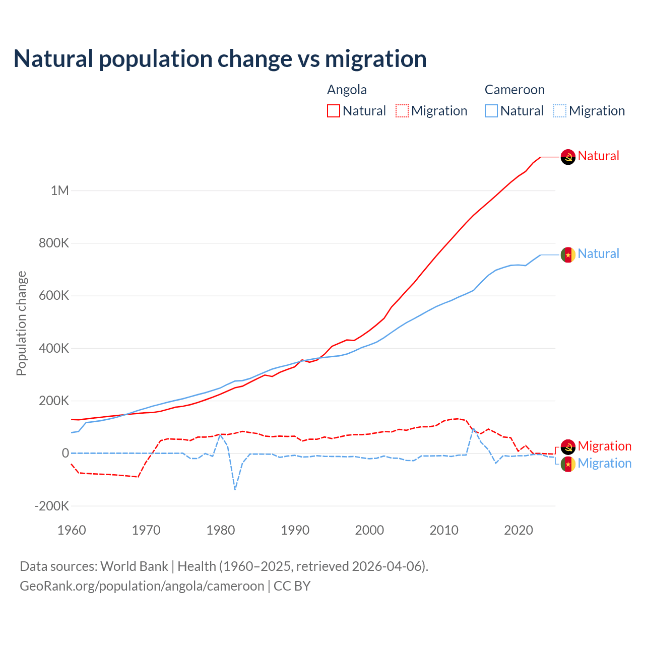 Over the last 10 years, 95.5% of the population change in Angola is from natural causes (a gain of 10,163,567 people) and 4.54% is from migration (a gain of 483,327 people). In Cameroon 99.1% is from natural causes (a gain of 6,982,395 people) and 0.9% is from migration (a gain of 63,139 people).