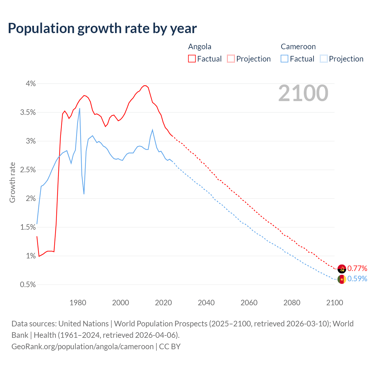 - For the last 10 years, Angola has had an average growth rate of +3.42% per year vs +2.84% in Cameroon.