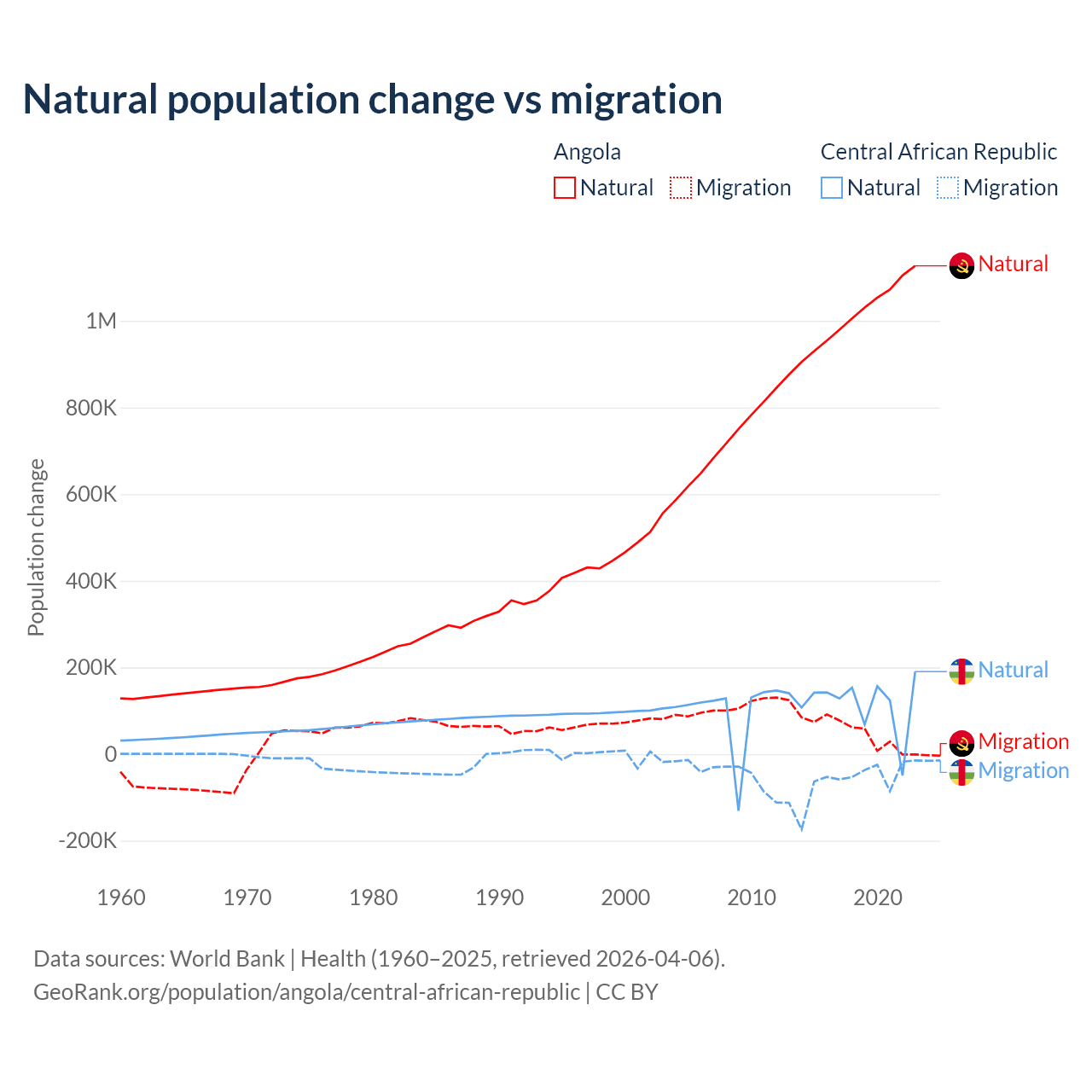 Over the last 10 years, 95.5% of the population change in Angola is from natural causes (a gain of 10,163,567 people) and 4.54% is from migration (a gain of 483,327 people). In the Central African Republic 66.7% is from natural causes (a gain of 1,164,312 people) and 33.3% is from migration (a loss of 580,593 people).