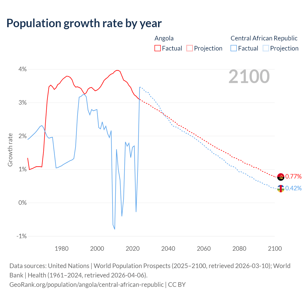 - For the last 10 years, Angola has had an average growth rate of +3.42% per year vs +1.27% in the Central African Republic.