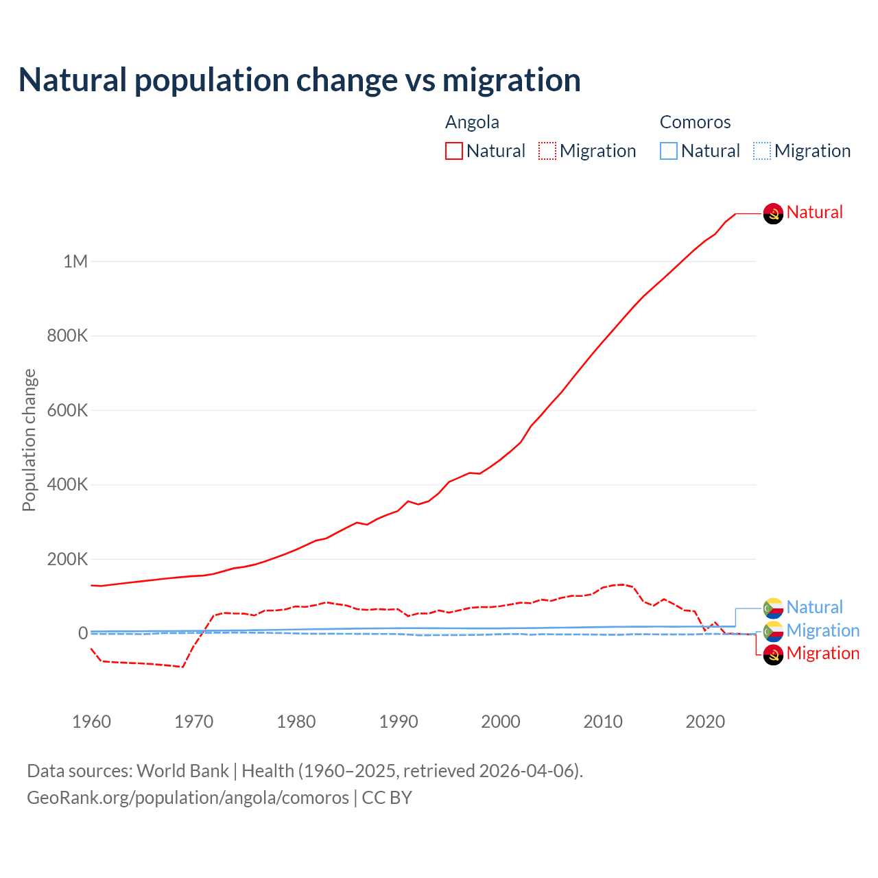 Over the last 10 years, 95.5% of the population change in Angola is from natural causes (a gain of 10,163,567 people) and 4.54% is from migration (a gain of 483,327 people). In Comoros 87.9% is from natural causes (a gain of 179,319 people) and 12.1% is from migration (a loss of 24,709 people).