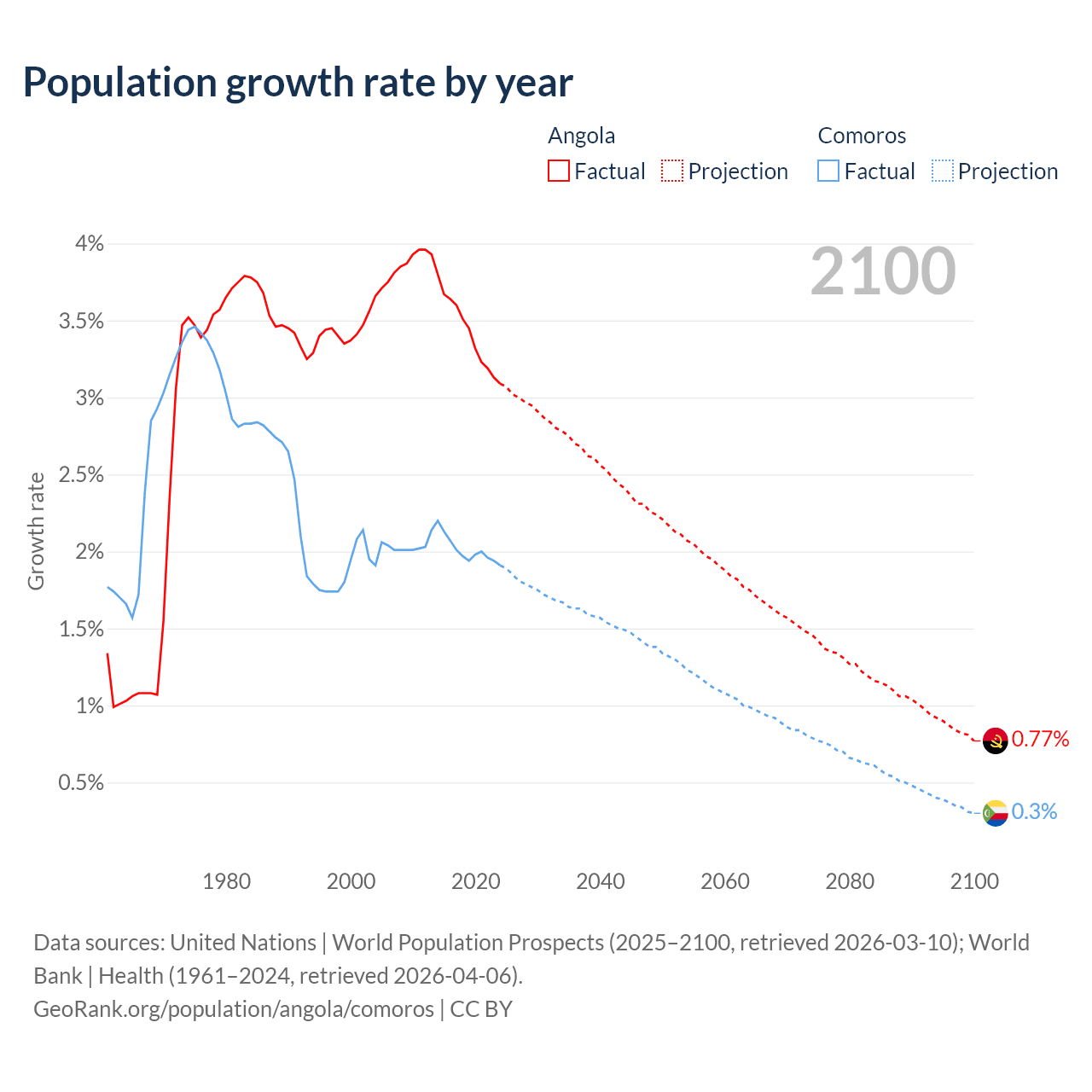 - For the last 10 years, Angola has had an average growth rate of +3.42% per year vs +2.01% in Comoros.