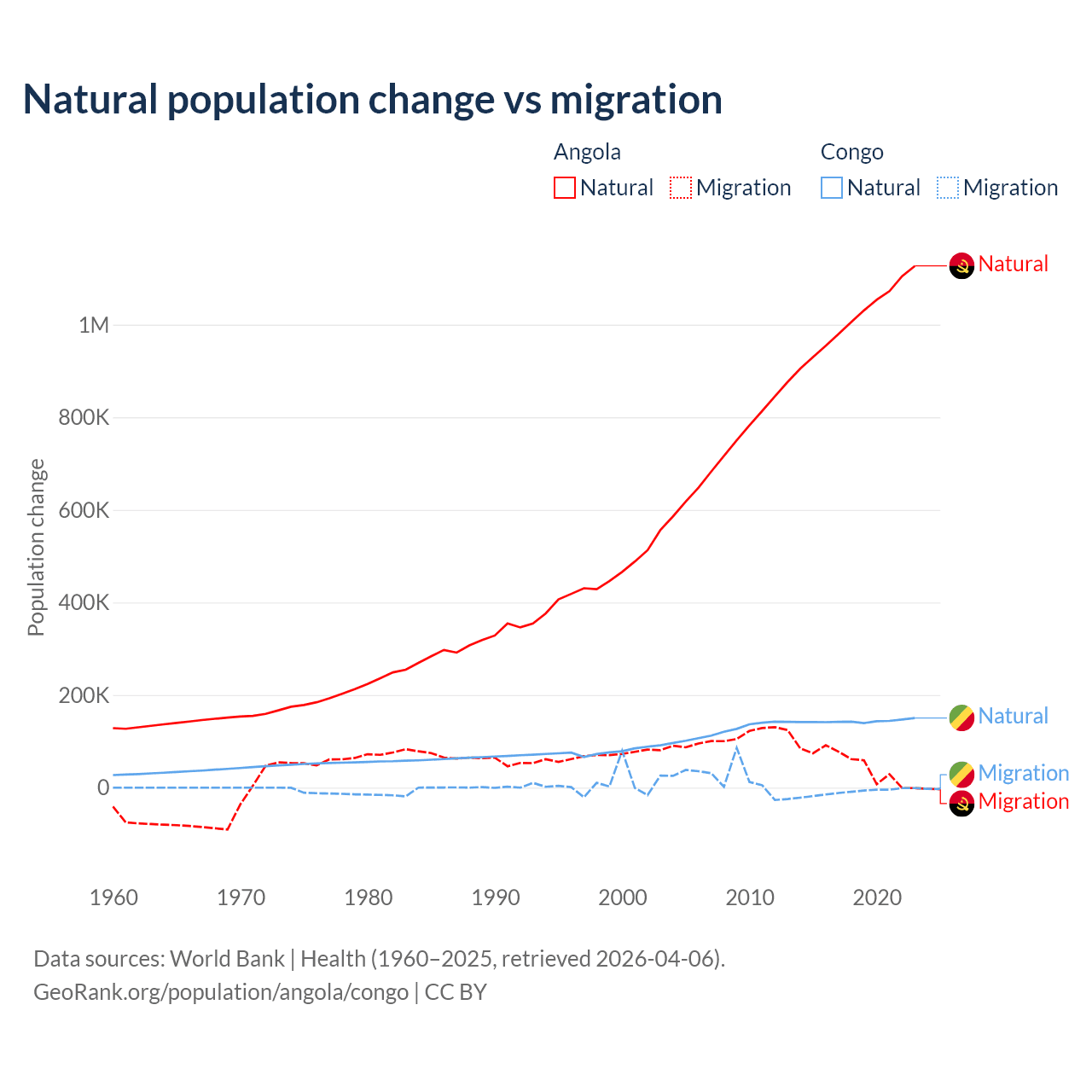 Over the last 10 years, 95.5% of the population change in Angola is from natural causes (a gain of 10,163,567 people) and 4.54% is from migration (a gain of 483,327 people). In the Congo 94% is from natural causes (a gain of 1,434,056 people) and 6.04% is from migration (a loss of 92,251 people).